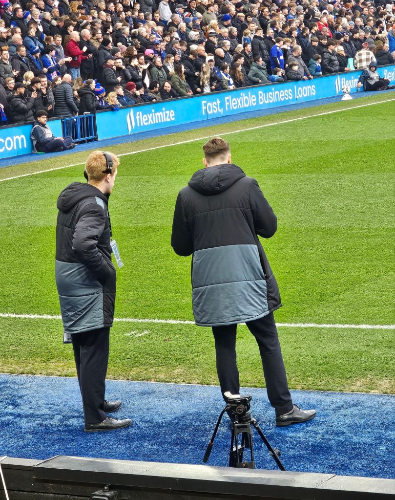 It has taken until the twenty-first minute for Town to win a corner, and eight minutes later they win another, but not before Leicester win one too. From the second Town corner Dara O’Shea heads narrowly wide at the far post when it looked as simple to score. “Come On You Blues” a few of us chanted, and it nearly worked. The thirty second minute is now here, O’Shea shoots over the Leicester cross bar and I notice that the seat in front of Fiona is occupied today by a man with no hair and the floodlights are reflecting off his shiny bald pate; visually he reminds me of the Catherine Tate character Derek, who would exclaim “How very dare you” whenever anyone inferred from his extreme campness that he was gay. “Blue Army, Blue Army” chant the Sir Bobby Robson standers as Town begin to dominate.