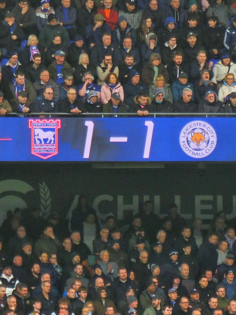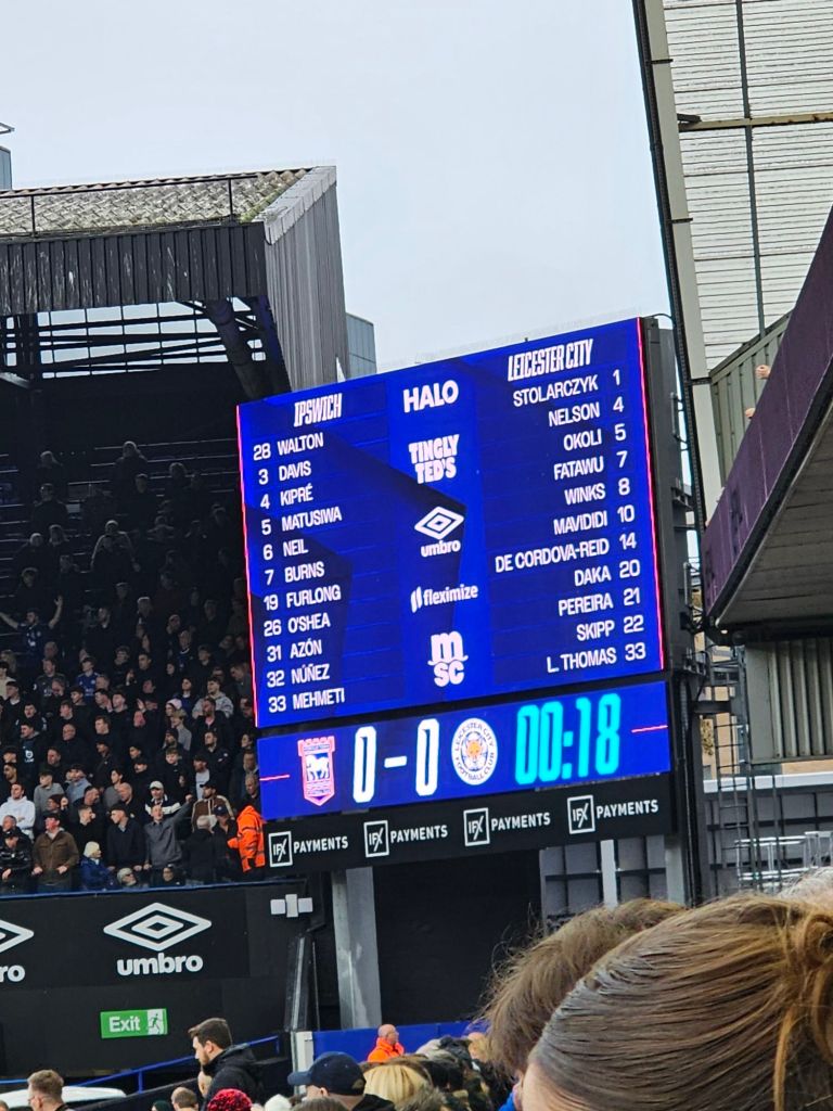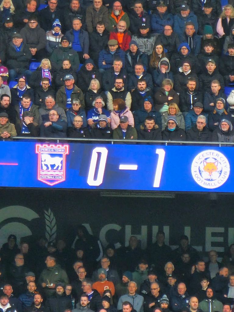 Back on the pitch Mr Busby just can’t help awarding free kicks whenever anyone falls over and from the latest injustice a deep cross is diverted into the Town goal net courtesy of a bloke from Zambia called Patson Daka. “Shit referee, shit referee, shit referee” chant the Sir Bobby Robson standers. “How shit must you be, we’re winning away” chant the Leicester fans and it’s not clear if their chant is directed at Ipswich or Mr Busby. Their claim to be the EFL’s most confused fans is quickly confirmed as they chant “Who are ya? Who are ya?” when only ten minutes earlier they had been chanting “Small club in Norwich, You’re just a small club in Norwich”. They need to make their minds up about what they think they know.