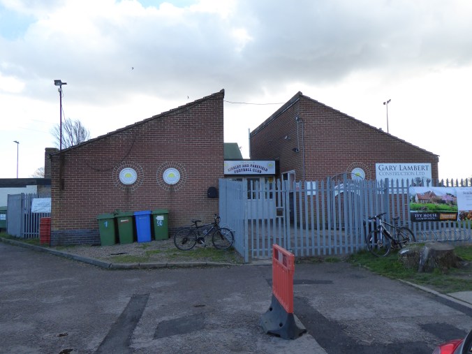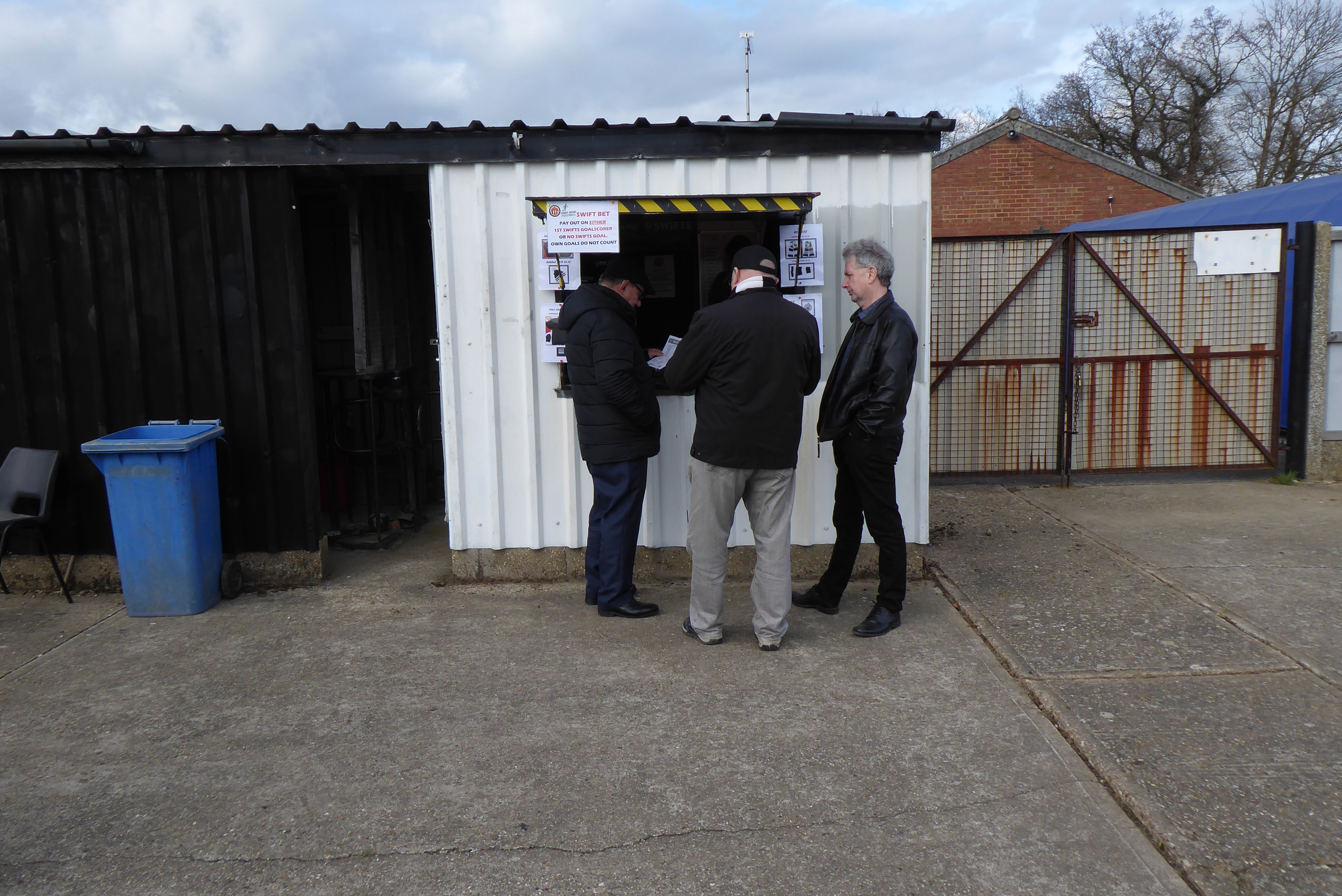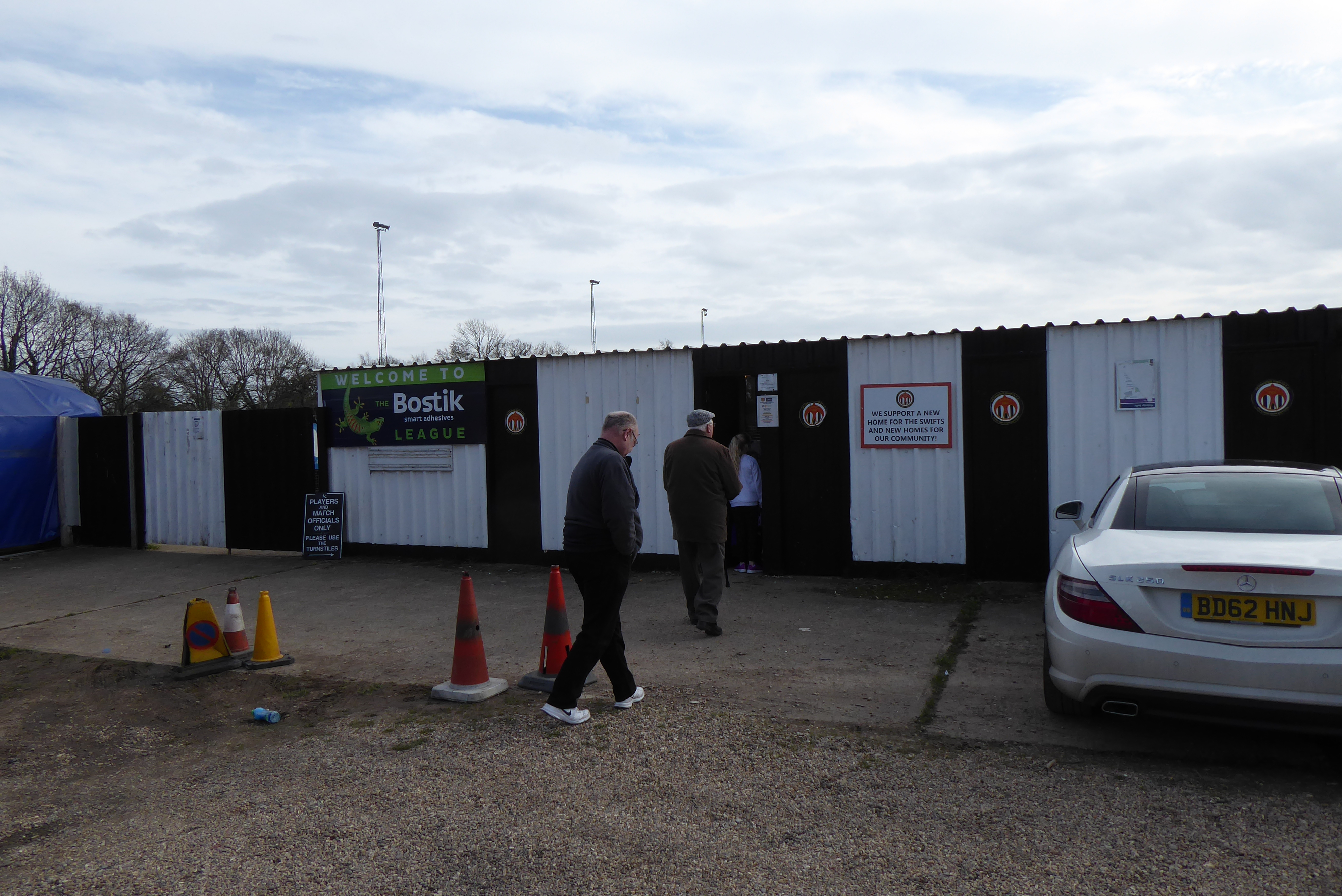 Leaving the B1022 I turn left into Scraley Road, home of Heybridge Swifts Football Club. Scraley Road is not an attractive name, it sounds a bit like Scaley Road and conjures up images of an unfortunate skin condition. It’s only about two-thirty but the rough, unsurfaced car park is already full; happily there is an overflow car park about 50 metres along on the right, although for some people that’s too far and they have chosen to park at the side of the road. The overflow car park is just a muddy track to the local rugby club but it’ll do and I pull up out of the mud and puddles onto a patch of lush grass to park the Citroen. I walk back to football ground which, as a large sign tells me, is now known as the Aspen Waite Arena, which sounds extremely posh. When did football grounds become arenas I wonder to myself; probably about the same time that ‘naming rights’ became ‘a thing’ I reply, but silently so as not to appear weird. I cross the main car park to the black and white painted metal turnstile block avoiding more puddles and form a fledgling queue behind one other person, although I have to walk around two others who seem to be having difficulty finding their money. Entry costs £10 for an adult and I ask for a programme too (£2). “There you are dear” says the friendly lady turnstile operator, handing me a glossy programme and a small amber cloakroom ticket with the word ‘Adult’ on, which I soon lose.