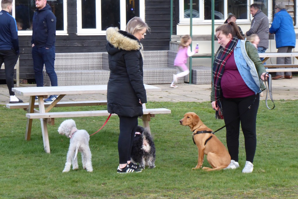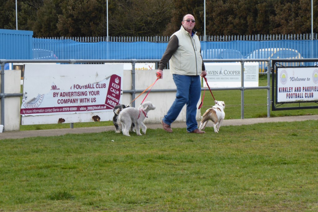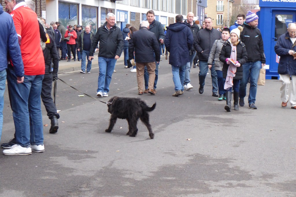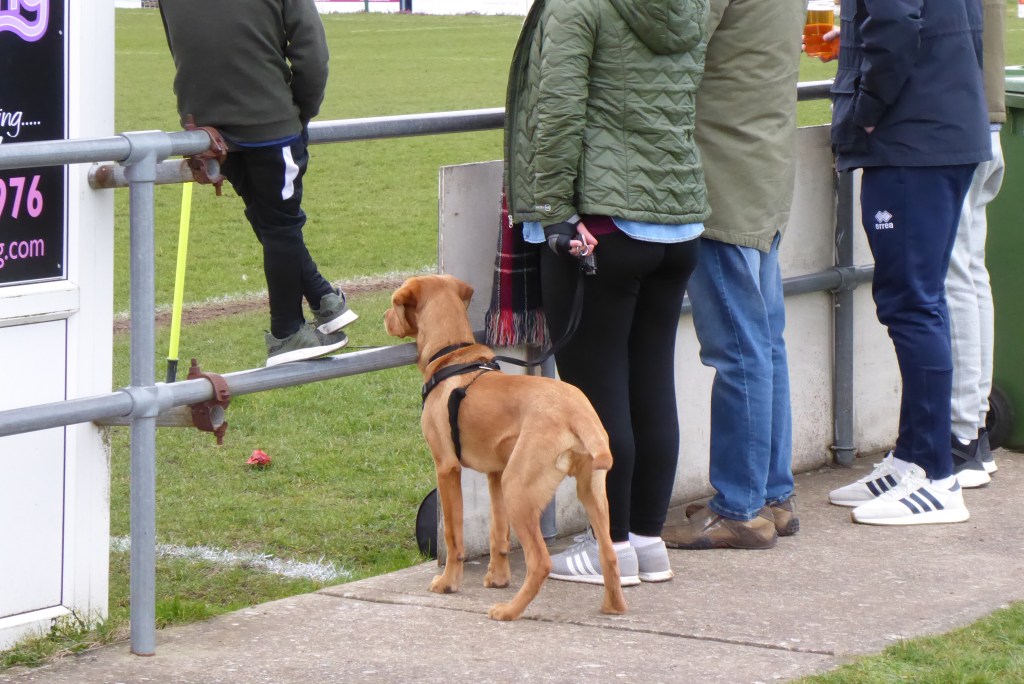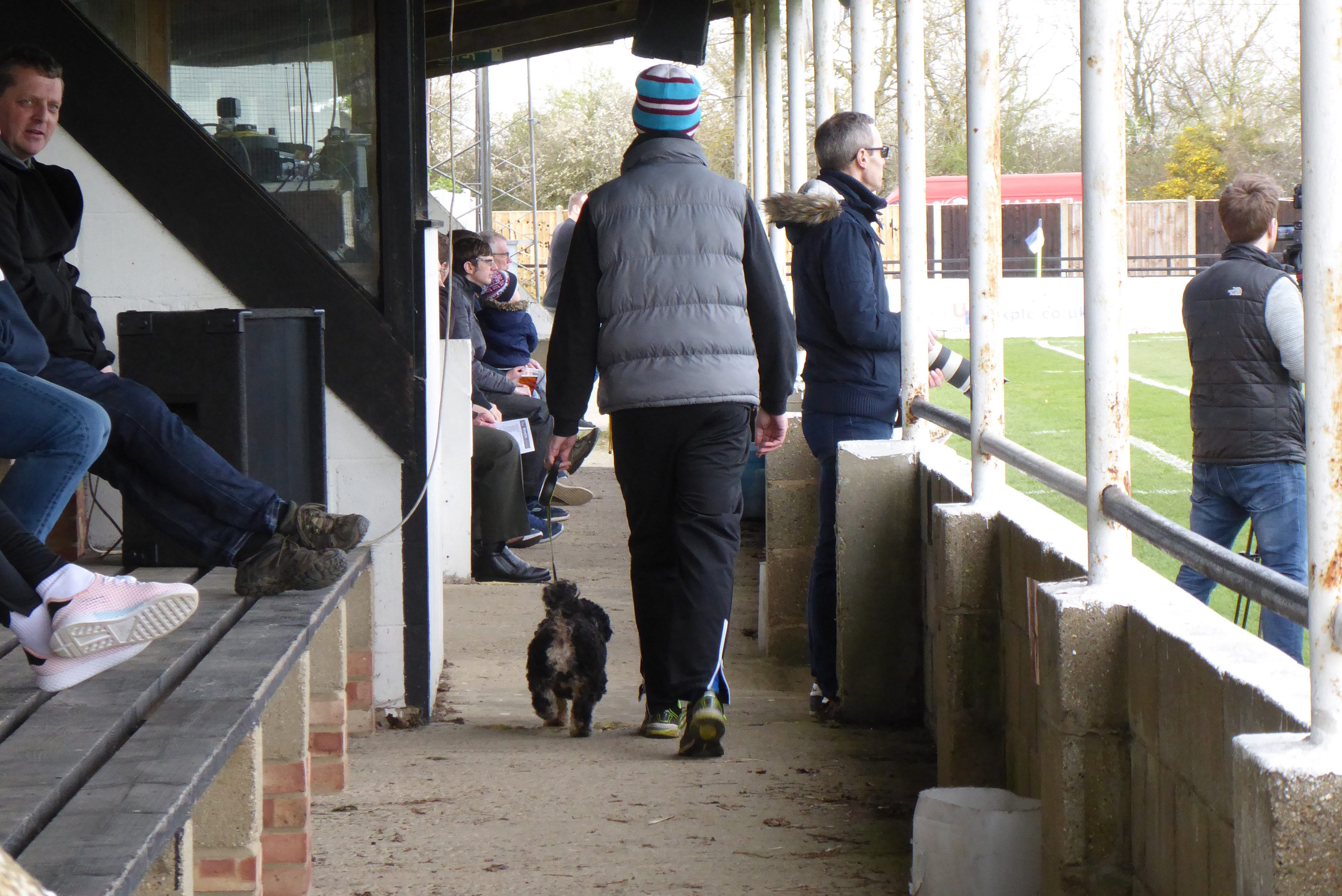 The name of Swifts’ Toib Adeyemi is an early entry in the notebook of the tall, elegant referee Mr Farai Hallam, but Swifts continue to get closer to the Grays’ goal than vice versa. It’s a bit after a quarter past three and Grays number 11 Joao Carlos surges past the Swifts’ left-back and crosses the ball, it ends up in the Heybridge net and Grays are winning; it’s an own goal and is attributed to Swifts’ number nine Daniel Walker. “Come on you Swifts” is the not-downhearted response from the terrace of the First Call Community Stand. A black-headed gull wheels above the pitch and disappears over the stand; I move from behind the goal to sit in the main stand, a structure with a row of tubular stanchions along its front, behind which the blue plastic seats have a shallow rake; it’s a classic non-league football stand in a classic non-league ground, a bit home-made looking and scruffy in places, but therein lies its character. A German Shepherd and two other dogs that look like poodles but aren’t look on, although it’s doubtful they brought themselves here on their own. As the half wears on I move again, closer to the tea bar this time, and am now amongst the Grays Athletic supporters. Grays are now doing better in terms of possession of the ball and are enjoying a few breakaways. Number eleven Joao Carlos is a threat down the left, “Go on Carlos” and “Get in the fuckin’ box” shout the Grays fans, before Carlos is booked by Mr Hallam for diving.