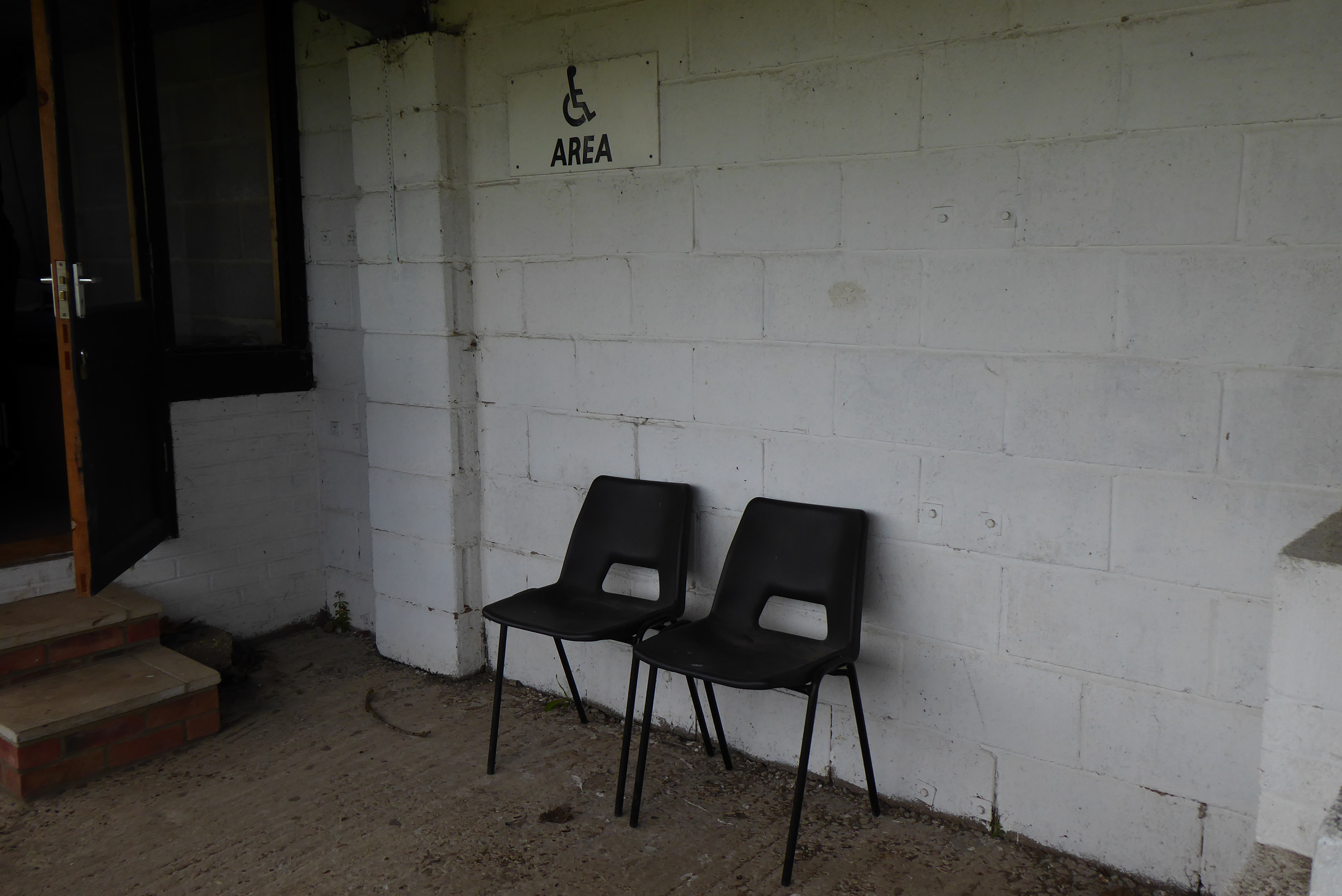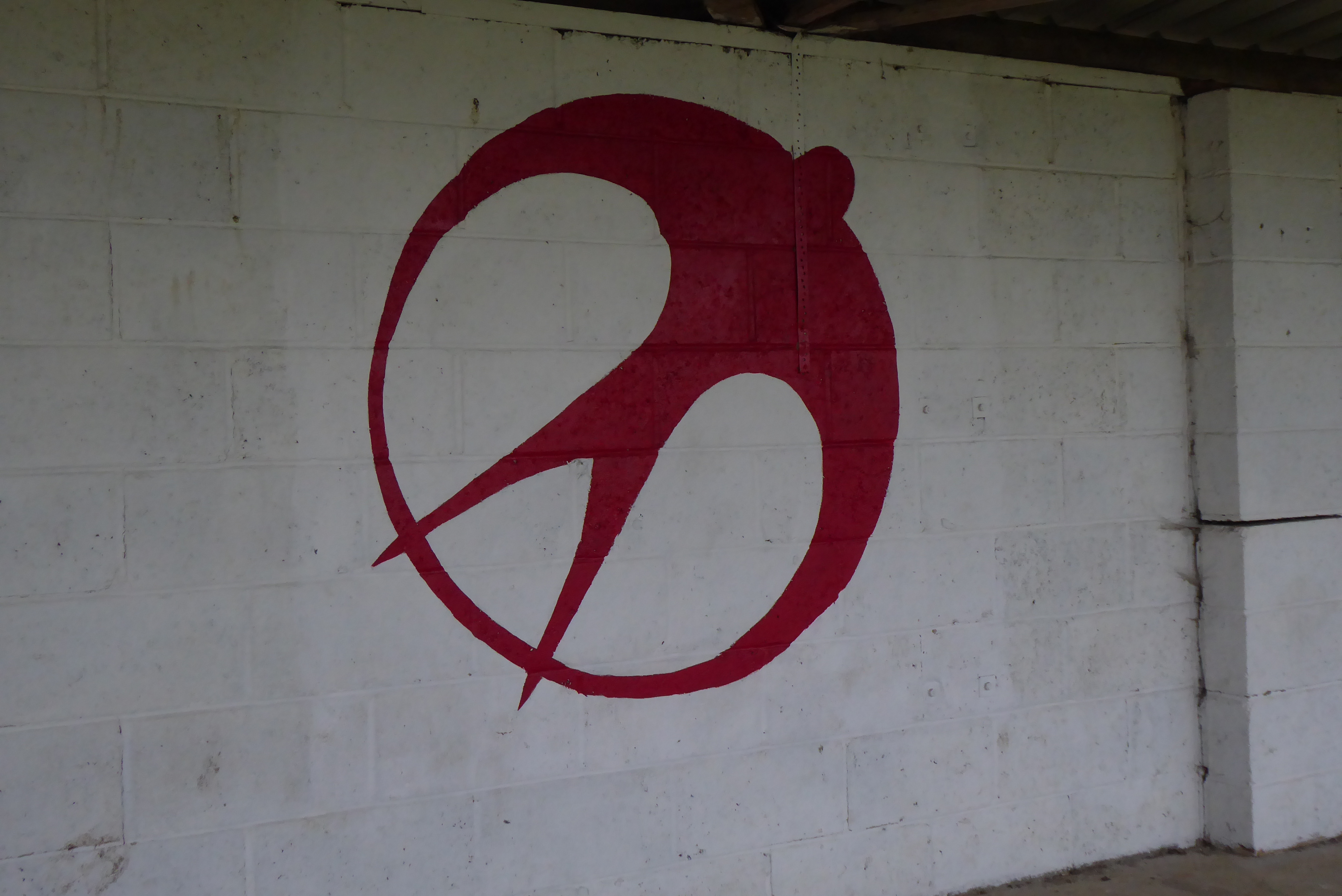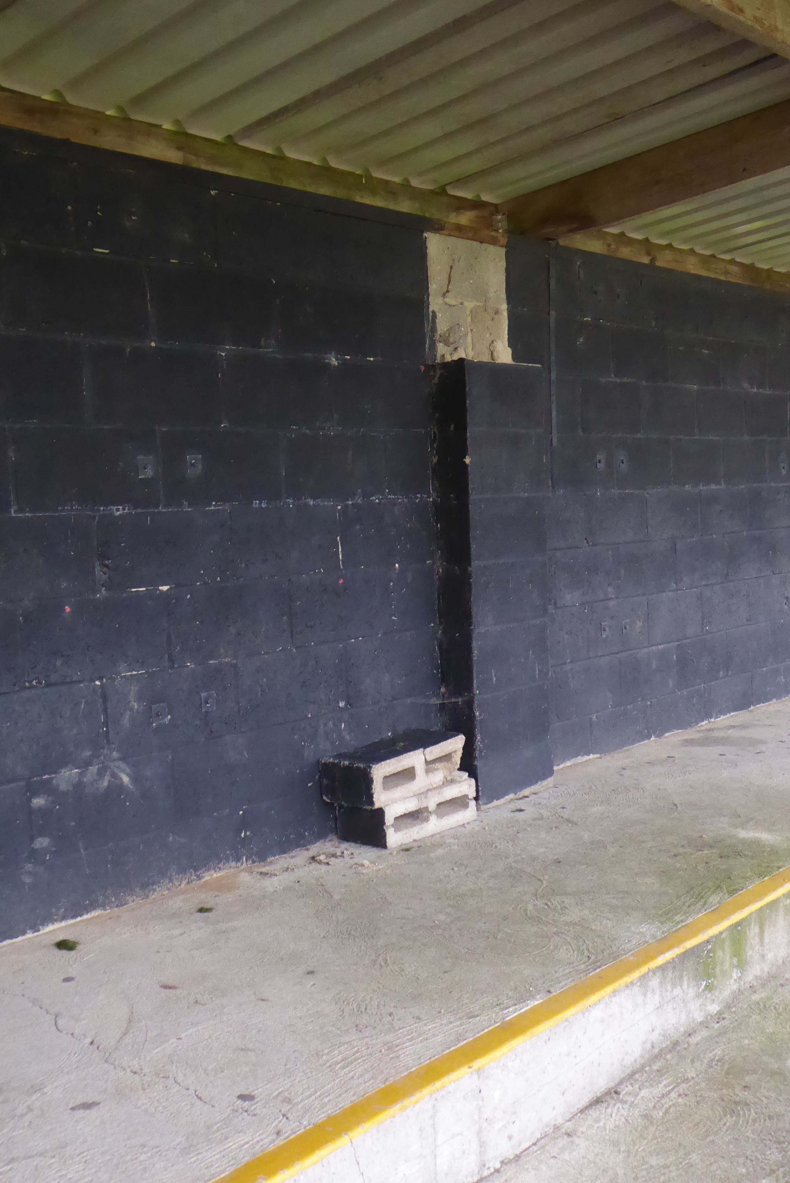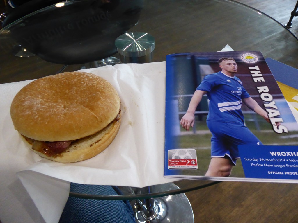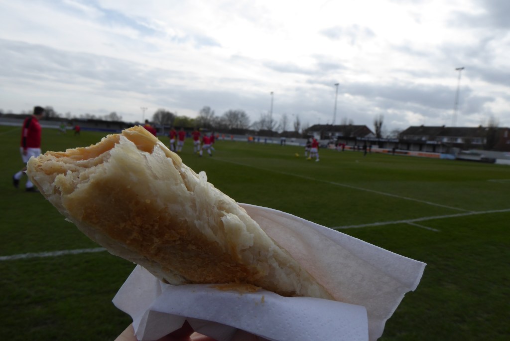 From the turnstile I emerge directly into an open space behind one of the goals; to my left a blue polythene tunnel doesn’t quite make it from the changing rooms to the perimeter of the pitch, beyond that is a well populated open patch of grass behind which sit the clubhouse/bar and the tea bar. I step inside the busy clubhouse but there’s no real ale on the bar, just the usual bland, mass-produced, heavily advertised fizzy stuff, so I head back outside to the tea bar to join a queue of one. With the previous customer gone away clutching a burger and cup of tea I ask the smiley-faced young woman behind the counter if there are any sausage rolls. There are and having found his oven gloves the ‘chef’, a more serious-faced, grey-haired man, takes a baking tray from the oven and prises a row of half a dozen sausage rolls from it with a spatula. I pay the young woman (£1.50) and smiling she hands me one of the ‘released’ sausage rolls in a white paper napkin. The sausage roll tastes much better for that smile but otherwise compares to one from Greggs, although not as greasy, which is a good thing.