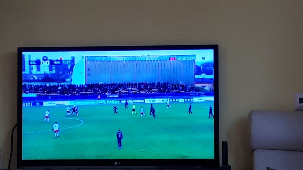 I lose interest in the Nice game as a result of that second goal and begin to only pay attention to the TV when the Multiplex coverage switches to the games at Stade de la Poterie in Prix-les Mézières and Stade de La Colombiere in Epinal. The game at Prix-les Mézières is between two clubs in the fifth tier of French football, the National 3. Prix-les Mézières is effectively a suburb of Charleville Mézières the principal town in the Ardennes département which borders Belgium and is about 330 kilometres and a three hour drive from Calais. Epinal is further south and east and is the principal town in the Vosges département. Epinal football club is in the fourth tier of the French leagues (National 2), whilst their opponents are in the first level of the Regional leagues which is the sixth tier.