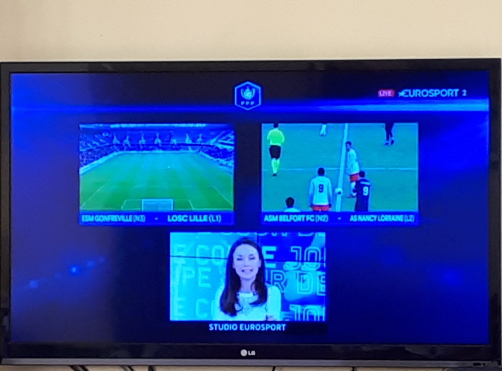 After a brief return to Gaëlle in the studio in suburban Paris, coverage of the three noon kick-offs quickly switches to the two ties which are beginning at two o’clock in Belfort and Le Havre. The Belfort game sees ASM Belfort of National 2 play AS Nancy Lorraine of Ligue 2, whilst in Le Havre, ESM Gonfreville also of National 2 play LOSC Lille, runners-up in Ligue 1 in the 2018-19 season. Whilst Belfort’s stadium, the Stade Serzian is another typical French municipal stadium with a single cantilever stand on one side, a running track and views of suburbia all around, Gonfreville, which is effectively an industrial suburb of Le Havre, are borrowing the modern and totally enclosed Stade Océane, the home of Ligue 2 Havre AC. Stade Océane, which looks as much like a giant, bright blue rubber dinghy as a football stadium, has made