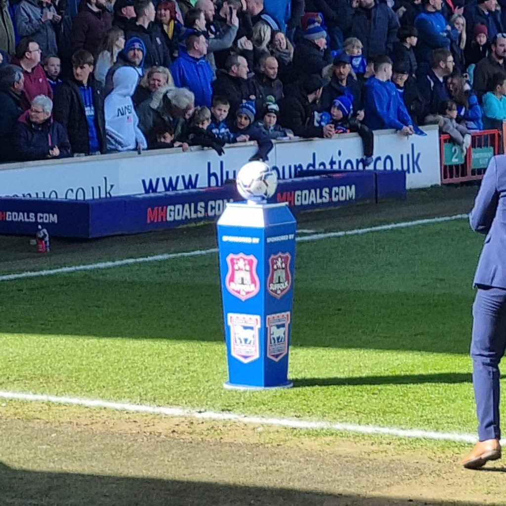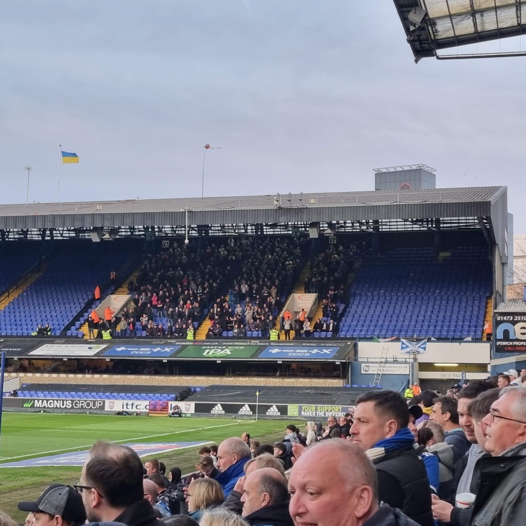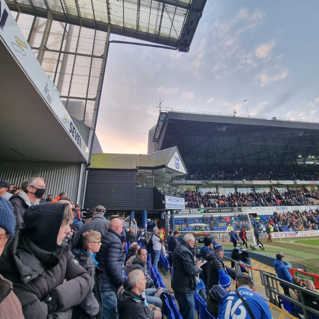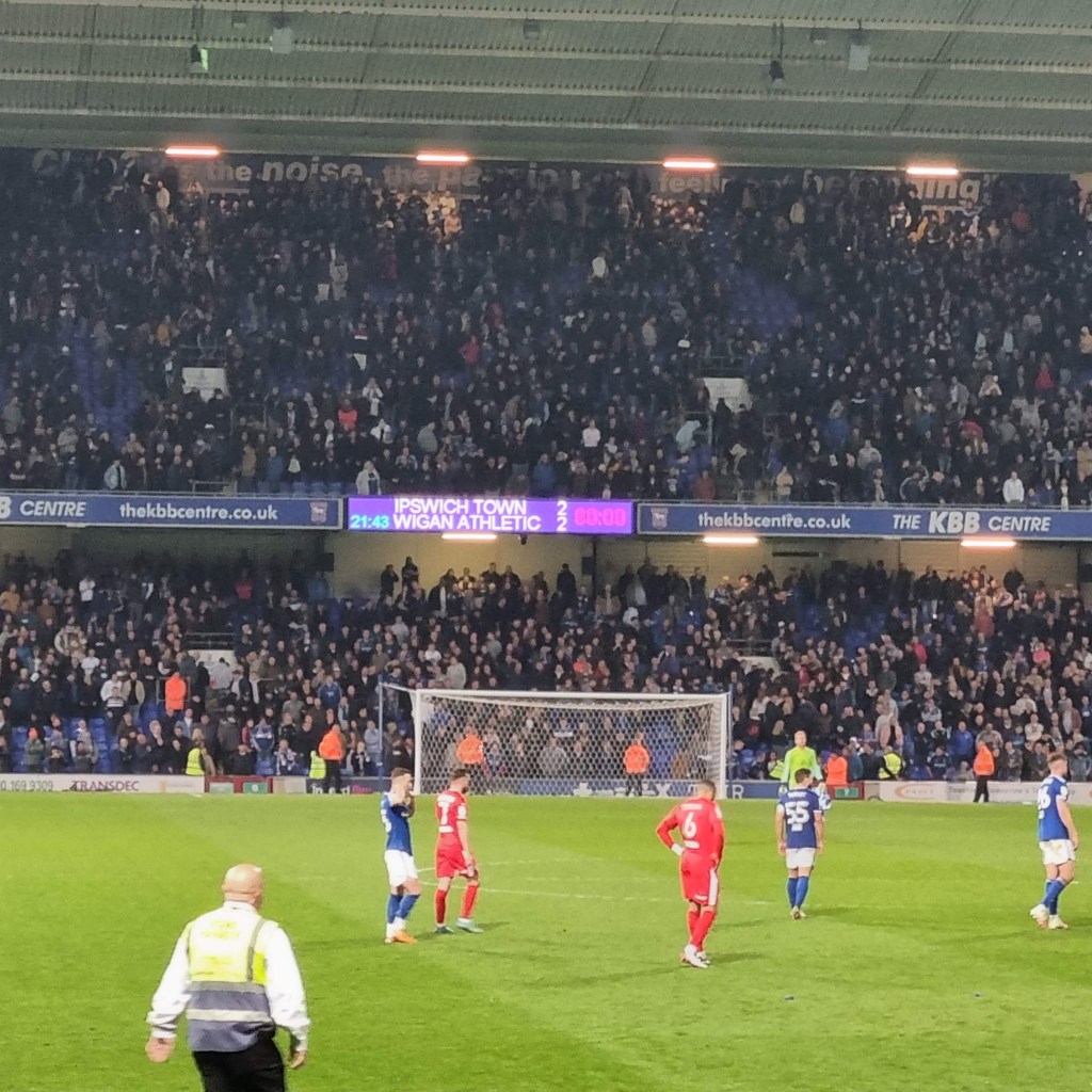 Above the North Stand roof and floodlights a smear of cloud adopts a pinkish tinge as the sun sinks down over Sproughton and a lone seagull glides above the pitch on its way back to the coast for the night. Twenty-five minutes have passed and Wigan’s Kelland Watts, whose name sounds a bit like the formal version of former Coronation Street character ‘Curly’ Watts, gets to be the first player shown the yellow card of referee Mr Will Finnie, after he fouls Conor Chaplin. Matt Penney and Bersant Celina rain in more crosses, which Wigan’s tough centre-back Jack Whatmough (pronounced Whatmuff I hope) sends out for another Town corner. “Are you working from home still?” asks Pat from Clacton of Fiona; she is. Town are all over Wigan like a rash but just can’t score. My neighbour from Stowmarket and I turn to one other and share how we just know that Wigan are going to go up the other end and score.