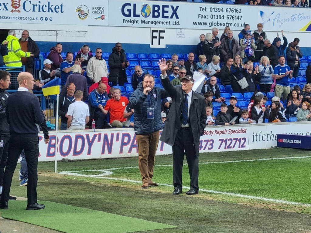 At half-time I speak briefly with Ray who has his wife Ros with him today; they have been enjoying pre-match hospitality in the form of a late breakfast in honour of their grandson Harrison’s 18th birthday earlier this week.  I speak with Harrison’s dad Michael and also give Harrison his birthday present, a copy of the CD ‘Robyn Hitchcock’ by the excellent Robyn Hitchcock, an artist who has provided the soundtrack to most of my adult life. Happily, Harrison will later let me know that he thinks the CD is “Brilliant”.  Meanwhile, behind us, public address compere Stephen Foster talks to true Town legend,  84 year old Ray Crawford, who was top scorer in Town’s Championship winning team of 1962 and even turned out for Charlton Athletic too a few years later.  If any other Town player ever deserves a statue it has to be Ray, Town’s all-time top scorer with 228 goals in just 354 games, no one will ever beat that. Returning to my seat,  I speak to ever-present Phil and let him know that I have e-mailed the club to suggest they paint or paper the walls inside the away supporters section to look like book shelves.  I am disappointed that I have not yet received any response other than that they will forward my e-mail to the ‘relevant department’.  I e-mailed again to ask who the ‘relevant department’ might be, but have not received a reply; they no doubt think I’m a looney.