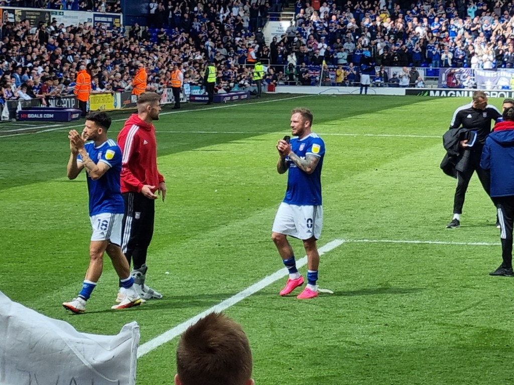 Thirteen minutes to go and Jayden Stockley heads against the Town cross bar. Three minutes later and a shout of “Handball! ” goes up from the Charlton fans. Nobody not in a red shirt knows why but there follows thirty seconds of every touch of the ball being greeted with a call of “ Handball” from the ever sarcastic people of Ipswich.  Charlton win a corner. “Charlton, Charlton!” shout the Charlton fans, showing how supporting your team is done, but it doesn’t bring a goal so it’s not worth it, although a prone Christian Walton does have to claw the ball down to stop it entering the net.  Six minutes to go and James Norwood replaces the oddly named Macauley Bonne to rich applause for both players.  James Norwood has announced that this is his last game for Town; if this were a US TV Cop show he’d get shot just before the final whistle, but happily it’s not.  Returning my attention to the actual football, “We want four” I think to myself half- imagining what Portman Road crowds of old would have chanted, and as I do so Cameron Humphreys threads a Conor Chaplin-style through-ball into the path of James Norwood who, from a very oblique angle steers it into the net, possibly off the goalkeeper, for his last ever Town goal. It’s only the third time Town have scored more than three goals at home this season and the it’s the biggest end of season win I’ve witnessed since Town beat Crewe Alexandra 5-1 in April 2005.   As Town fans cheer, Charlton fans sing “We forgot you were here” and three minutes of time added on melt away into forgotten history.