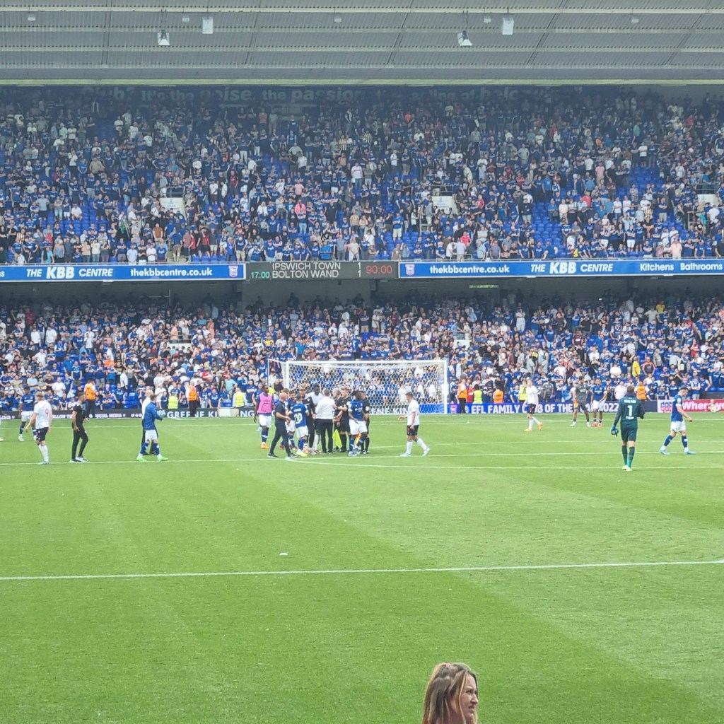 Both teams continue to make substitutions like they’re going out of fashion, making four each with Sone Aluko and Kayden Jackson replacing Conor Chaplin and Freddie Ladapo for Town. Ipswich dominate, pinning back Bolton and making them play sardines in their own penalty area. It’s a niggly game as both teams display their frustration at being unable to beat the other. The crowd is announced as 26,688, and it seems wakes week has come early with 1,392 pale and pasty-faced folk from the mills and the mines making up the numbers in the Cobbold Stand. Pat from Clacton wins the guess the crowd competition on the Clacton supporters’ bus with a prediction of 26,679; she seems a little shocked but I can tell she’s excited by her win, it’s been a long time coming.