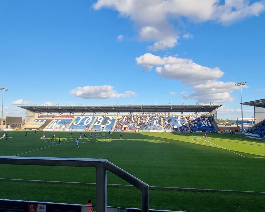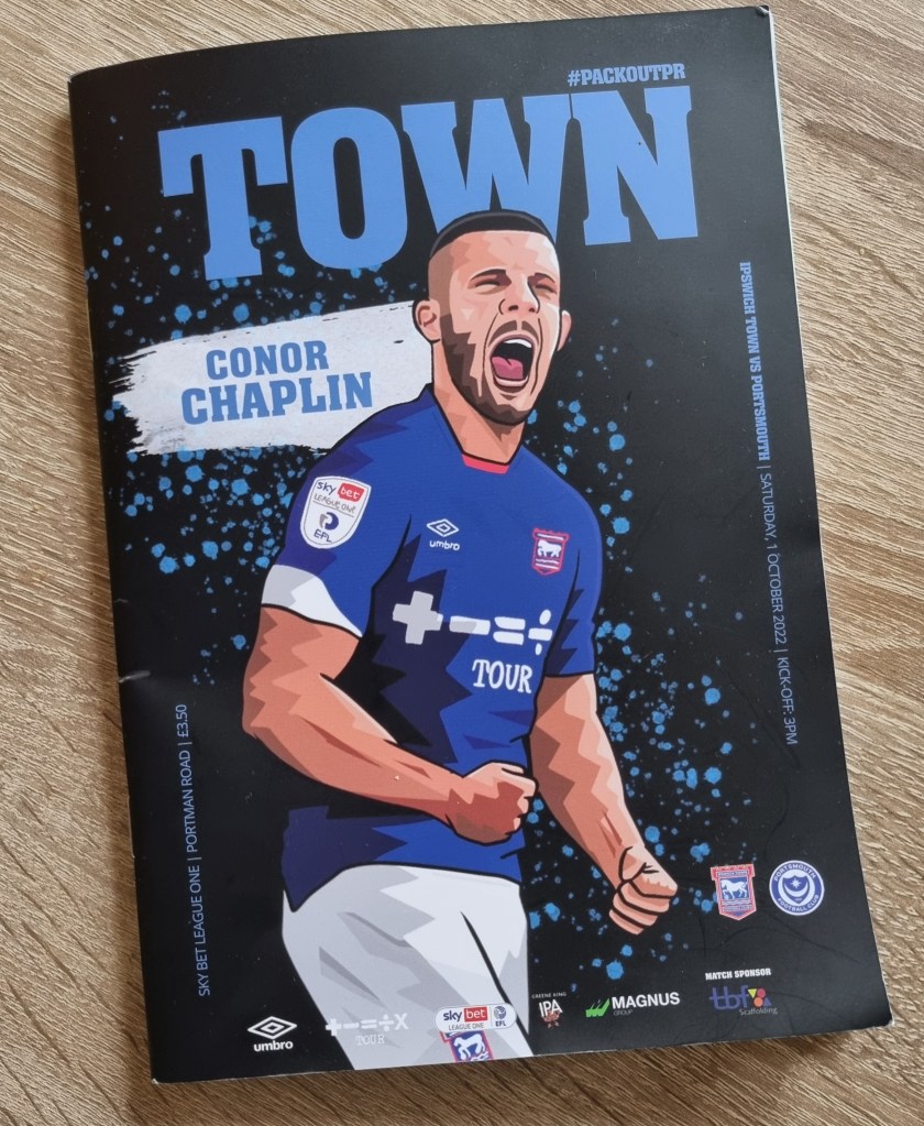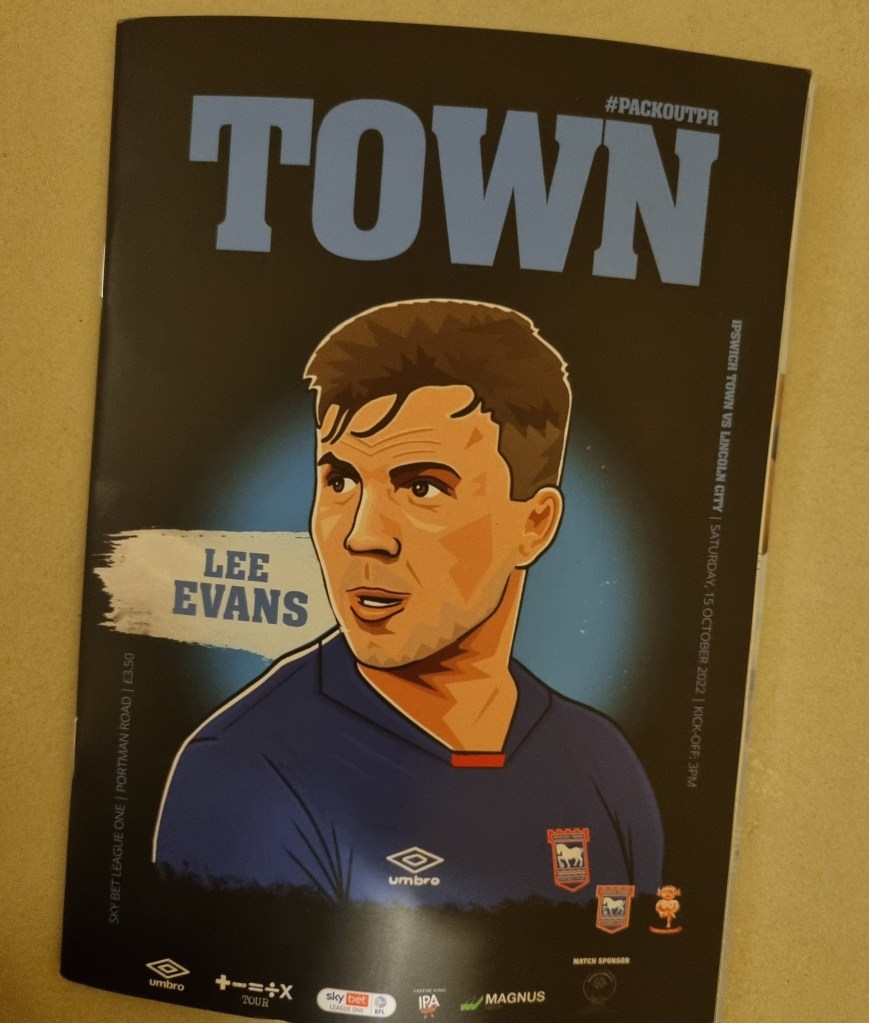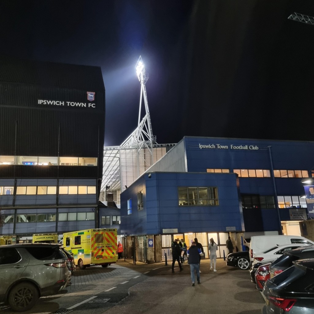 A young bloke with a beard sits himself down in Pat from Clacton’s seat. I give him a look like Paddington Bear. “Is this seat free” he asks a little nervously. “Well, there’s no one sitting there tonight” I tell him in a voice that’s as close as I can get to sounding like a Suffolk Johnny Cash. He smiles broadly. I think I’ve put him at his ease. On the pitch the play is frenetic, with both teams trying to play neat, passing football but frequently interrupting one another. Sam Morsy is booked after just ten minutes for a foul on the wonderfully named Lewis Dobbin. Ipswich have more success at getting close to their opponents’ goal and win three early corners, George Edmundson heads wide and Tyreece John-Jules clearly dives in the penalty area having won a few free-kicks already elsewhere. I thought it was an obvious dive; the way he had already established eye-contact with referee as he fell gave it away, a bit like a Labrador staring at you as you eat your dinner. He should be told to leave any desire to cheat in North London where it belongs, or Kieran McKenna will write to his mum.