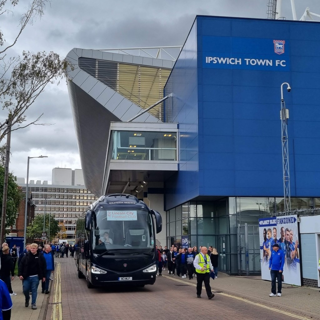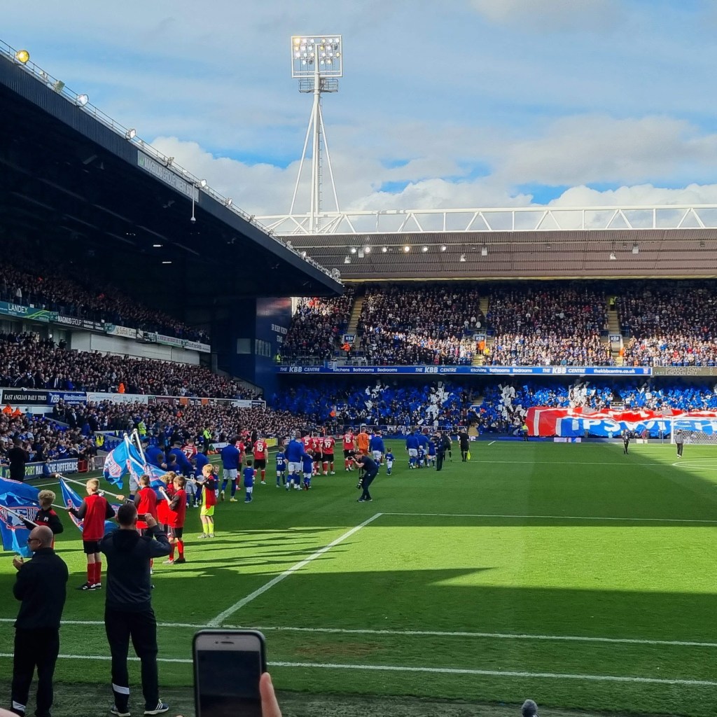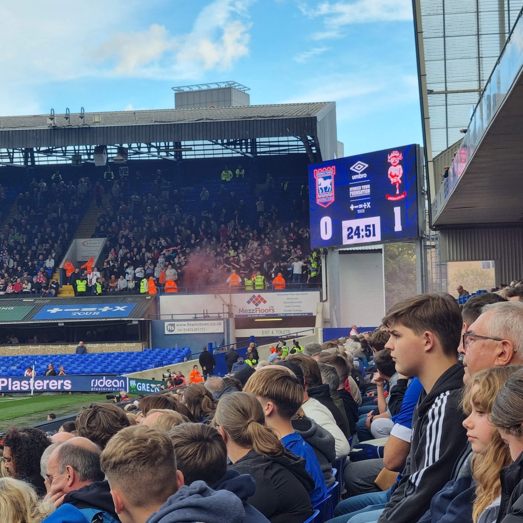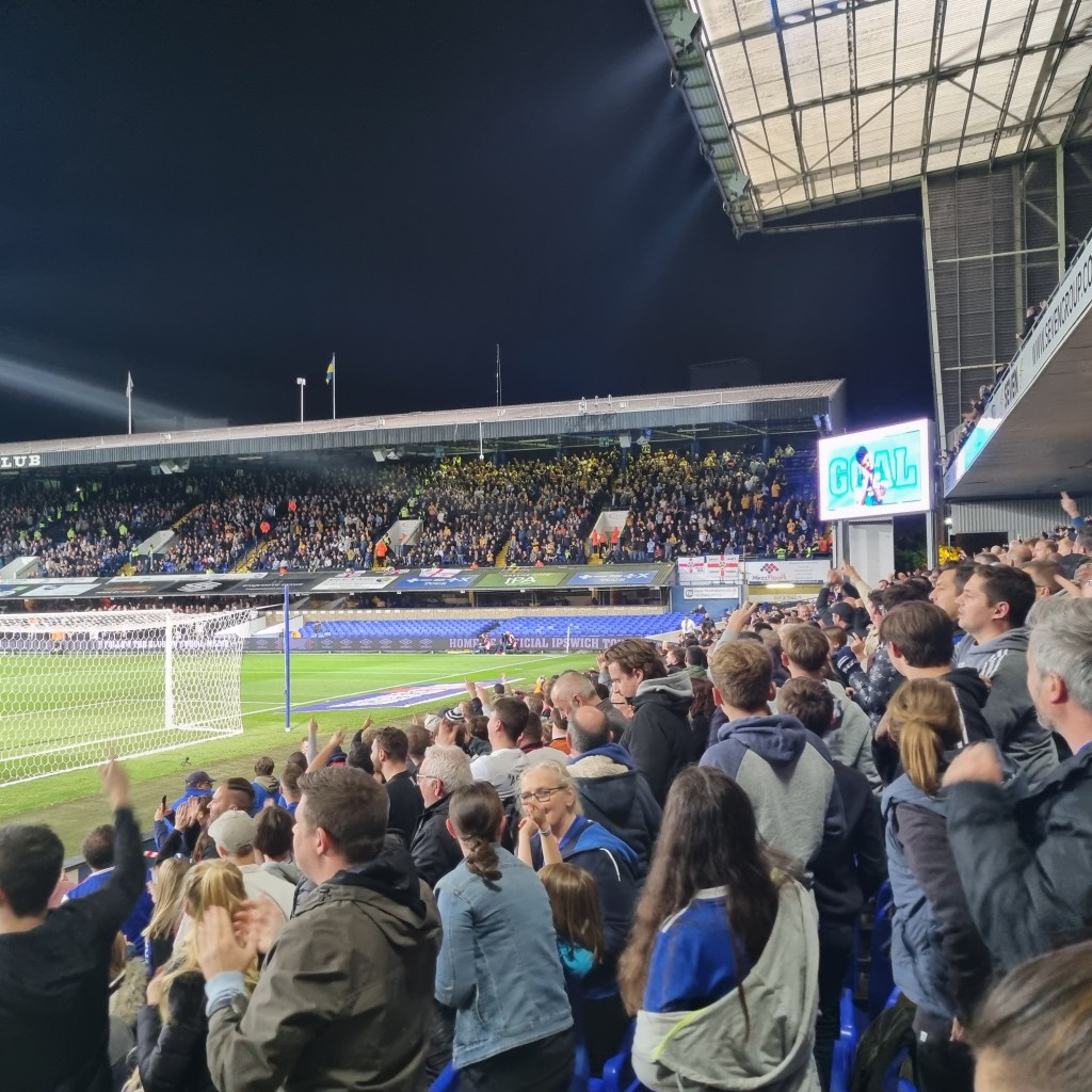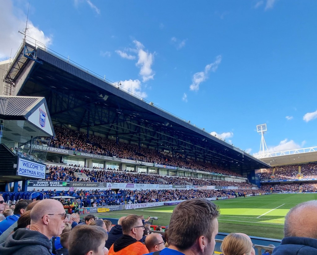 “Come on Dorby” comes the chant from the Cobbold Stand and I think I detect a hint of a Midlands accent. Soon the away support are riffing on a familiar theme, “Football in a library, de-de-dur” is followed by “No noise from the Tractor Boys” and “Shall we sing a song for you” as the youth of Derby vainly goad the pensioners and families in the Sir Alf Ramsey Stand, who stoically wait for Town to take the lead before thinking about whether they might start to clap or break a smile. But the ground has gone a little quiet, they’re right.