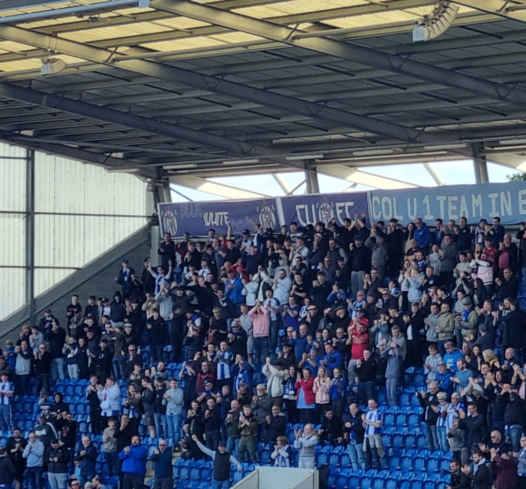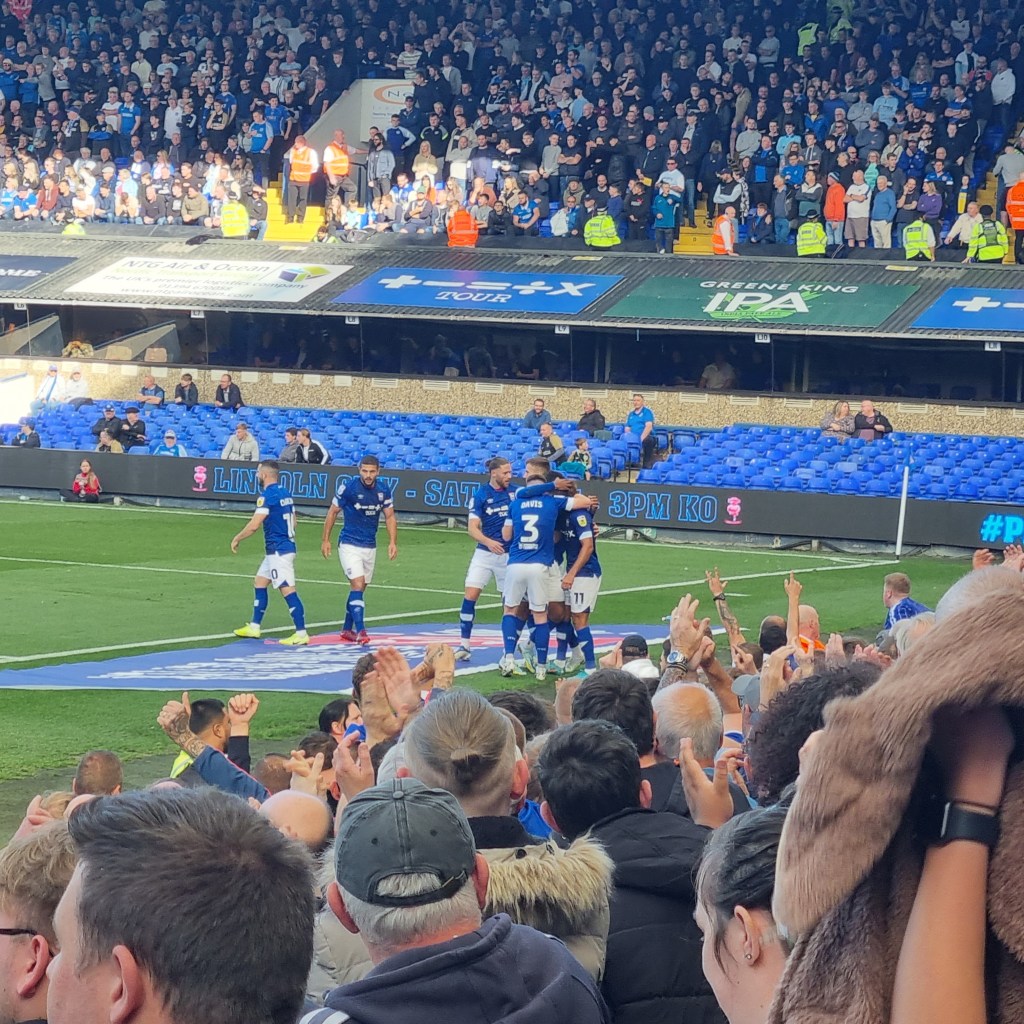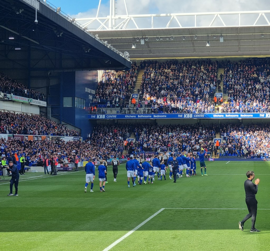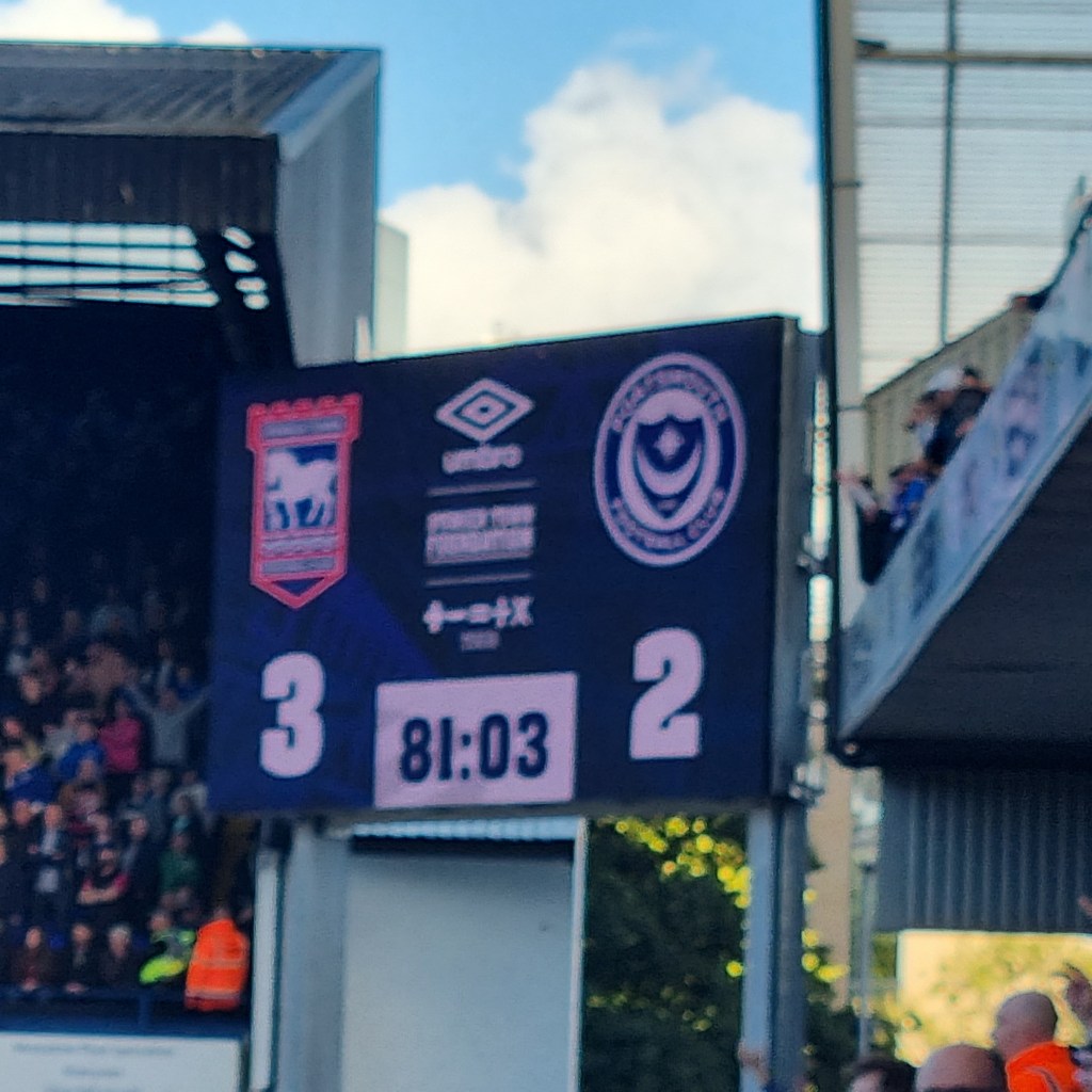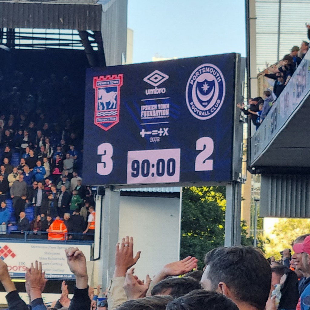 The second half is a better ‘watch’ for home fans even if it is ‘all up the other end’ from my perspective in the Sir Alf Ramsey Stand. In the sixty-seventh minute it all gets much better still as Kayden Jackson breaks down the right, loses the ball but carries on running as the unsuspecting Derby defender decides on a back pass which is nothing more than a pass to Jackson who shoots on goal. The ball hits the post but rebounds to Wes Burns who has plenty of time to hit the ball into the net and give Town a lead which they now probably deserve, and they haven’t even made any substitutions yet. I remember to take ever-present Phil’s photo for Pat from Clacton as Phil and his son Elwood hold their arms aloft whilst grinning joyfully. “E-i E-i E-i-o, Up the Football league we go” sing the Town fans, and not to be outdone the Derby fans sing the same before deciding that they would be better served by a chorus of the sneering “Sing when you’re winning, you only sing when you’re winning.”