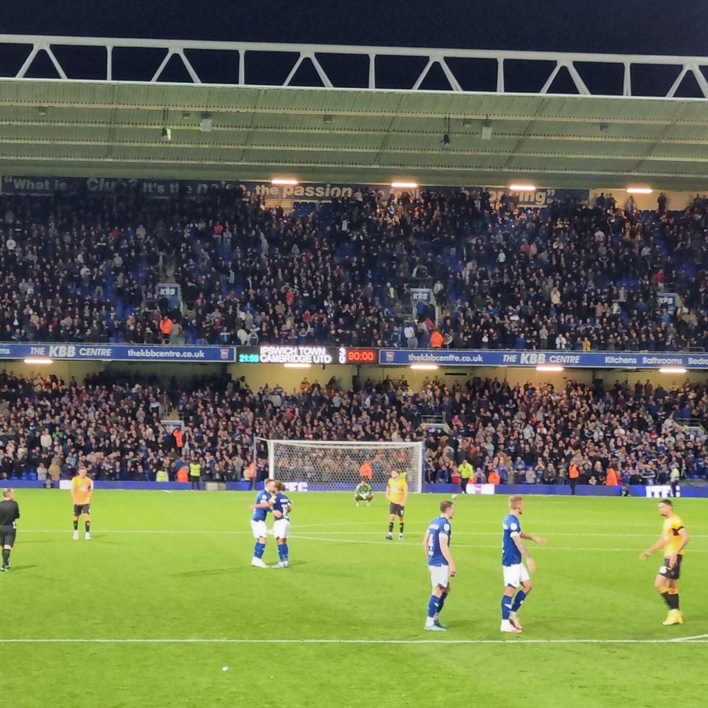 With the start of the game come the chants from both sets of supporters, Derby transporting us back to the 1970’s by repeating “Derby, Derby, Derby” over and over again to the tune of ‘Amazing Grace’, just like Town fans used to chant “Ipswich, Ipswich, Ipswich” in that run to the FA Cup semi-final in 1975, the year Derby last won what I believe is now called the Premier League. “Score in a minute, we’re gonna score in a minute” continue the Derbeians less nostalgically but more optimistically. “Addy, Addy, Addy-O” add the Town fans from what in 1975 was the North Stand, and there are even a few chants of the same from the top of what was the West Stand. It’s a sign that the stadium must be as good as full to capacity.