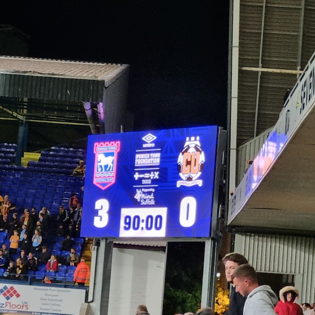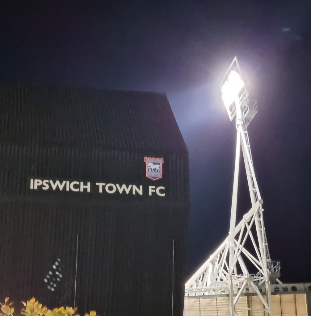 Portman Road and Sir Alf Ramsey Way are less busy than usual when we arrive because most people are already inside the ground. As I hasten through the turnstiles, I can hear former BBC Radio Suffolk presenter Stephen Foster ‘giving it large’ as he reads out the team line-ups in his archetypal radio DJ manner; he sounds even more Tony Blackburn than usual tonight, no doubt for the benefit of Sky TV. By the time I take my seat next but one to the man from Stowmarket, the teams are on the pitch, and the Town team are forming a collaborative huddle preparing to start the match. It’s Town who get first go with the ball I think, I’m not really paying attention yet as I get to grips with seeing Ipswich wearing all black and Derby in maroon or burgundy shirts and white shorts. I imagine Derby think they look exotic like AS Roma or Sparta Prague, but they remind me of Northampton Town. As for the Ipswich team, they look like Johnny Cash, though I guess that’s preferable to looking like Ed Sheeran.