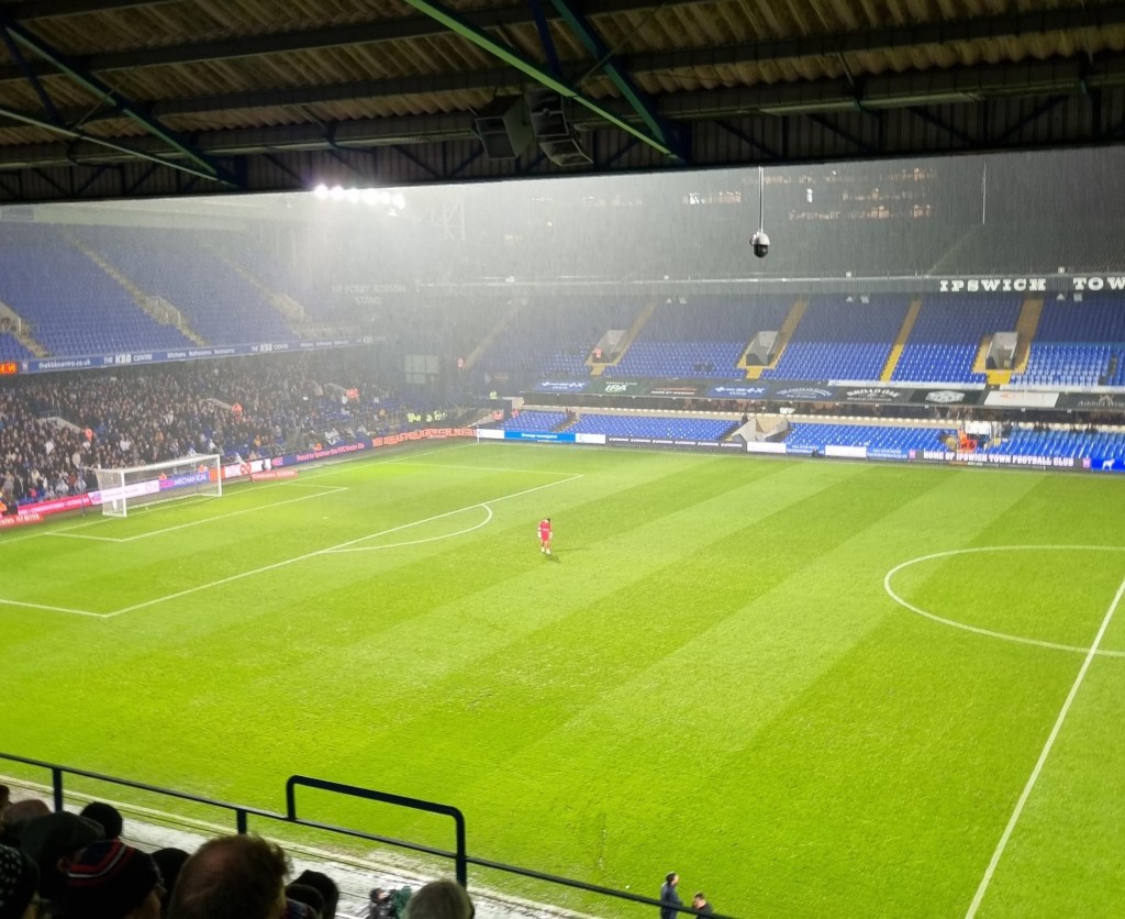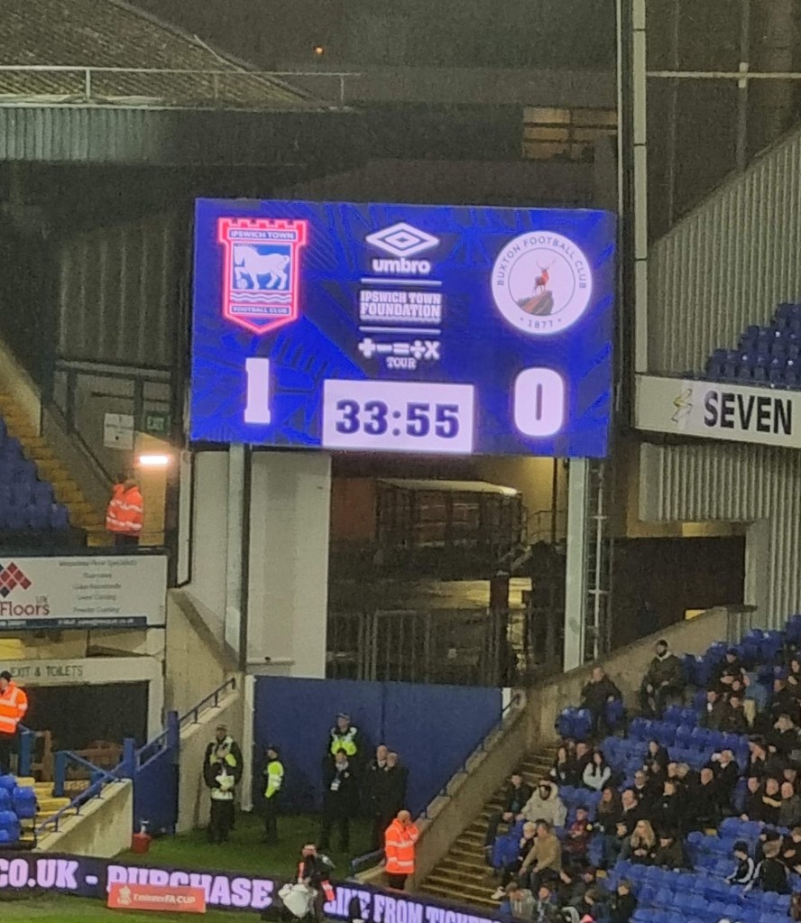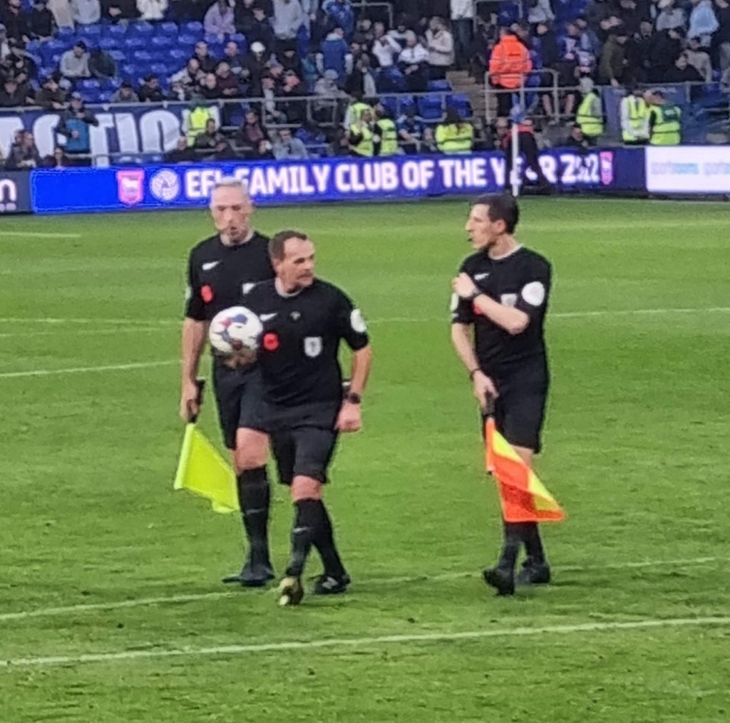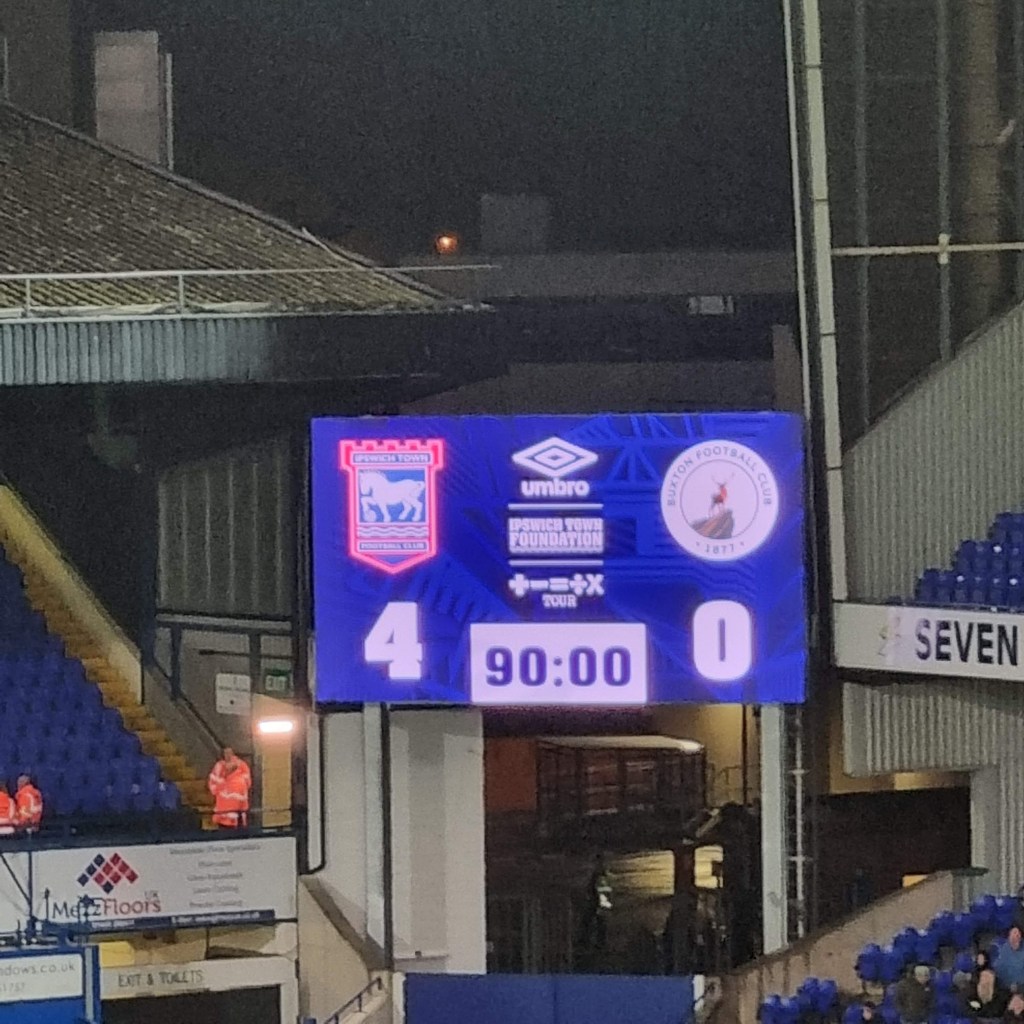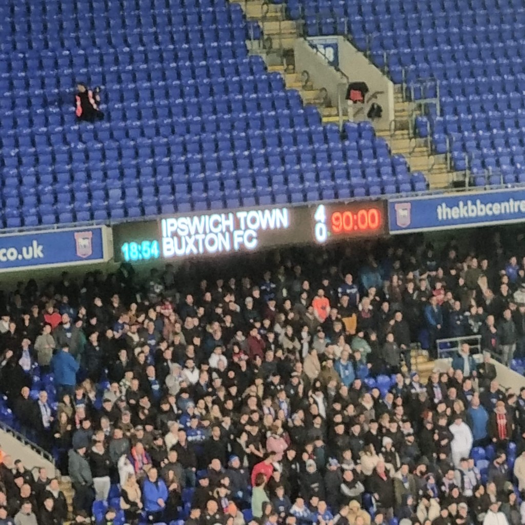 “Shall we sing, shall we sing , shall we sing a song for you?” ask the Buxtonians through the medium of Cwm Rhondda, which seems appropriate if this is evensong. Sufficiently goaded by the Buxtonians up in the Cobbold stand, a few of the occupants of the Sir Bobby Robson stand summon a limp rendition of “Come On You Blues” before a more lively burst of rhythmic clapping emerges and even a few extroverts around me in the Magnus west stand join in . The first half is half over, but Town are now into their passing stride and are putting in crosses and looking likely to score. “Addy, Addy, Addy-O” chants what used to be the North Stand. “Come on ref” moans the woolly-hatted geriatric next to me for some reason I haven’t spotted. Beyond the dark sloping roof of the Magnus Stand the fine steady drizzle looks like steam. The first Buxton player is booked and then referee Mr Ross Joyce gets into his stride too and records the name of Town’s first Welsh Scandinavian Geordie, Leif Davis in his little notebook too. It looks like a second Buxton player has got away with a foul on Kyle Edwards but it’s as if Mr Joyce is thinking to himself, “No, I think I will book him after all” and shows a slightly belated yellow card.