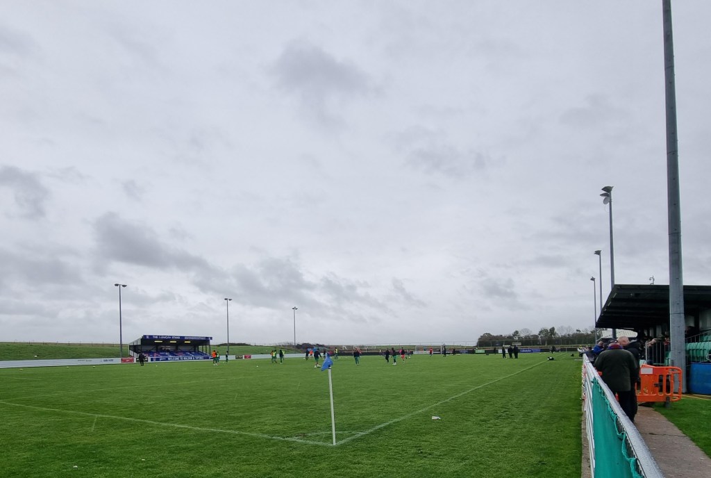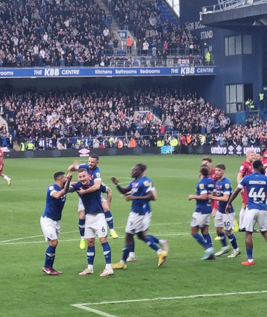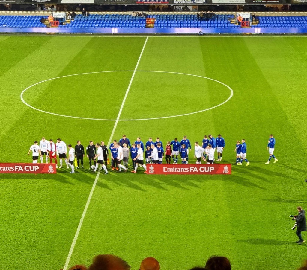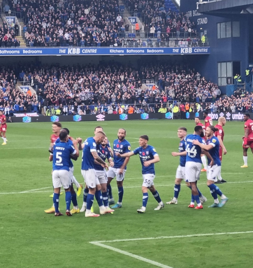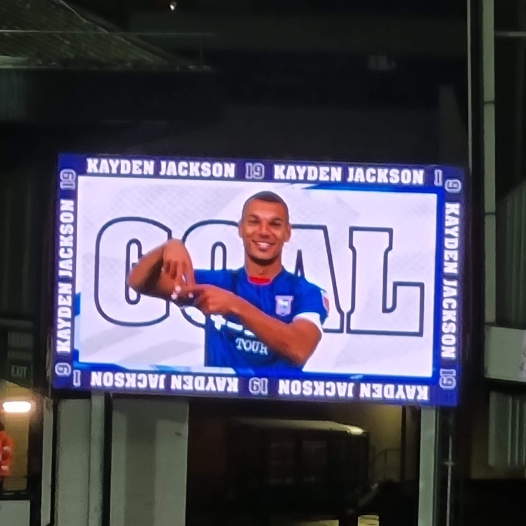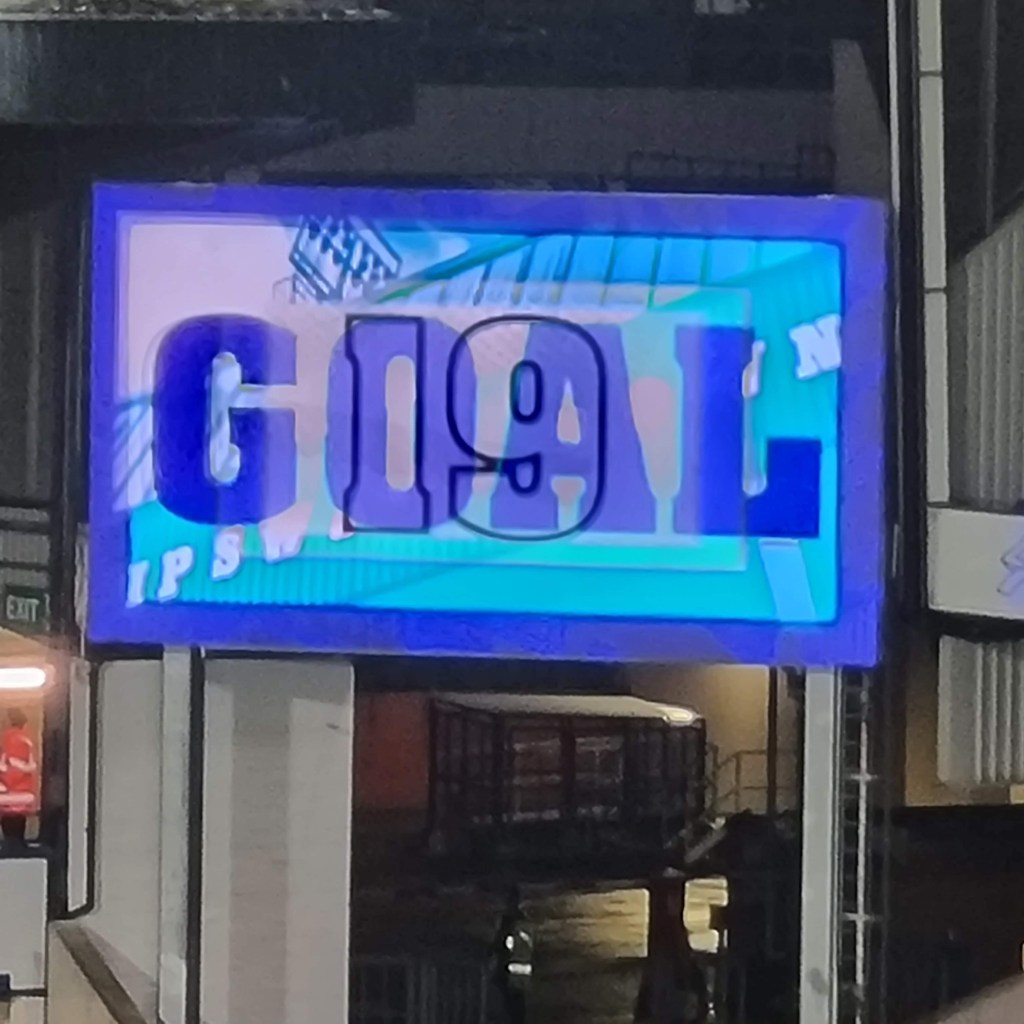 “Shall we sing, shall we sing , shall we sing a song for you?” ask the Buxtonians through the medium of Cwm Rhondda, which seems appropriate if this is evensong. Sufficiently goaded by the Buxtonians up in the Cobbold stand, a few of the occupants of the Sir Bobby Robson stand summon a limp rendition of “Come On You Blues” before a more lively burst of rhythmic clapping emerges and even a few extroverts around me in the Magnus west stand join in . The first half is half over, but Town are now into their passing stride and are putting in crosses and looking likely to score. “Addy, Addy, Addy-O” chants what used to be the North Stand. “Come on ref” moans the woolly-hatted geriatric next to me for some reason I haven’t spotted. Beyond the dark sloping roof of the Magnus Stand the fine steady drizzle looks like steam. The first Buxton player is booked and then referee Mr Ross Joyce gets into his stride too and records the name of Town’s first Welsh Scandinavian Geordie, Leif Davis in his little notebook too. It looks like a second Buxton player has got away with a foul on Kyle Edwards but it’s as if Mr Joyce is thinking to himself, “No, I think I will book him after all” and shows a slightly belated yellow card.