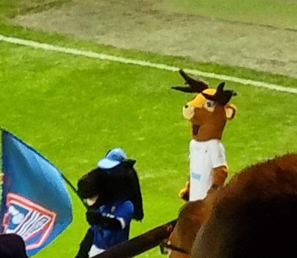 We take our seats just as the teams are walking onto the pitch past Crazee the mascot and a mysterious reindeer; we stand to applaud and stay on our feet as there is a minute’s applause for the recently deceased David Johnson, arguably Town’s third best-ever centre-forward after Paul Mariner and Ray Crawford. We will later learn that there are fewer than 10,000 of us in Portman Road this evening, but there is nevertheless a frisson of excitement around the ground as a fine drizzle starts to fall and the game begins with Town kicking off towards what was Churchman’s when David Johnson last played here. Buxton are wearing a kit of white shirts and dark blue shorts giving them the air of a poor man’s Tottenham Hotspur, and oddly they have no players of colour.
