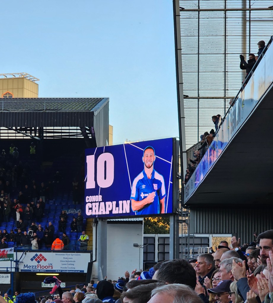 “Millwall, Millwall – Millwall, Millwall, Millwall – Millwall, Millwall, Millwall- Millwall, Millwall“ sing their fans imaginatively to the tune of Que Sera Sera. “Blue and White Army, Blue and White Army” is the quite a bit less tuneful Ipswich response, and the mist and fog rolls in over the roofs of the stands to replace all the condensing moisture burnt off by the flames moments before. “Addy-Addy, Addy -O” sing the Sir Bobby Robson Stand . Barely six minutes of the usual opening exchanges passes and Wes Burns takes on the Millwall full-back and gets beyond him to cross the ball for George Hirst to head down and back for Conor Chaplin to half volley into the Millwall goal past Bartosz Bialkowski, and Ipswich lead one nil having not conceded an early goal. Conor Chaplin thanks Goerge Hirst who thanks Wes Burns and Sam Morsy gives thanks to Allah.