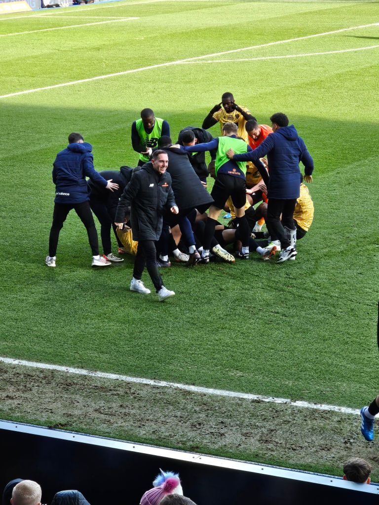 At twenty-six minutes to two, the match re-starts and Mick returns, pie-less, I guess they ran out of vegans. As the Maidstone fans resume their chants of “Black pepper army” Gary explains that they are actually singing “Black and Gold Army”, which makes me think I should perhaps get a hearing aid like his. Ten minutes of Ipswich domination pass and then Jeremy Sarmento cuts in from the left, shoots, and scores. I leap up and wave my arms about like a man with only a sketchy understanding of semaphore and receive a text message from a friend in Weymouth that reads “That’s more like it”. Town have equalised and will surely soon score a second, third and probably a fourth goal as the Earth returns to its normal orbit around the sun and the clocks stop going backwards.