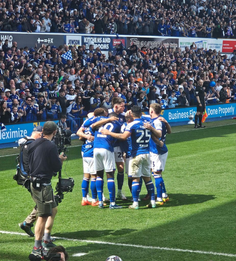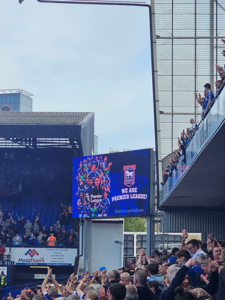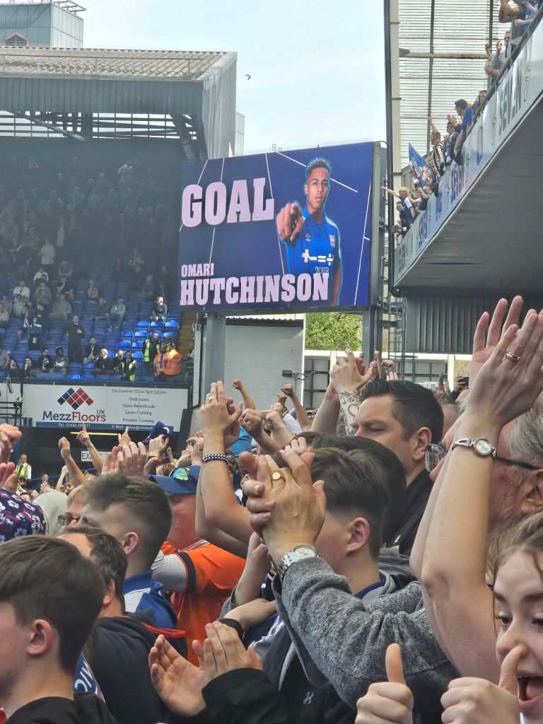For twenty minutes it’s like being present at a concert of Town supporters’ greatest hits of the 2023-24 season. “Are you watching Norwich scum?”, “Carrow Road is falling down”, “One Marcus Stewart.” punctuate corners and a shot over the bar from Leif Davis. The usual double or triple substitutions on the hour aren’t really needed today, so are delayed until the seventy-third minute and serve only to draw ovations for a season’s efforts from the departing players. Announcer Murphy announces today’s attendance as 29,011 and even the seat next to me is occupied, by an extremely tall youth who neither says nor sings anything. “Small Town in Norwich, You’re just a small town in Norwich” chant the Huddersfield fans bizarrely, or at least those who’ve never seen a map of Britain do. But “The Town are going up, The Town are going up” is the carefree response to the intended sleight.