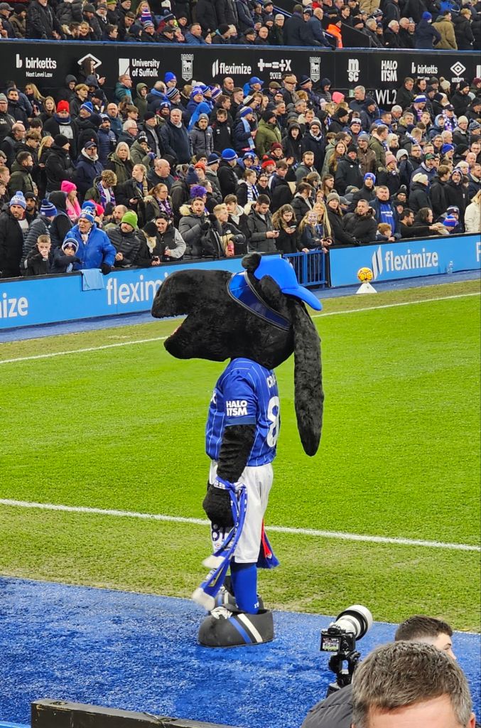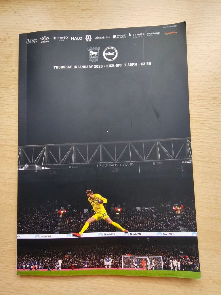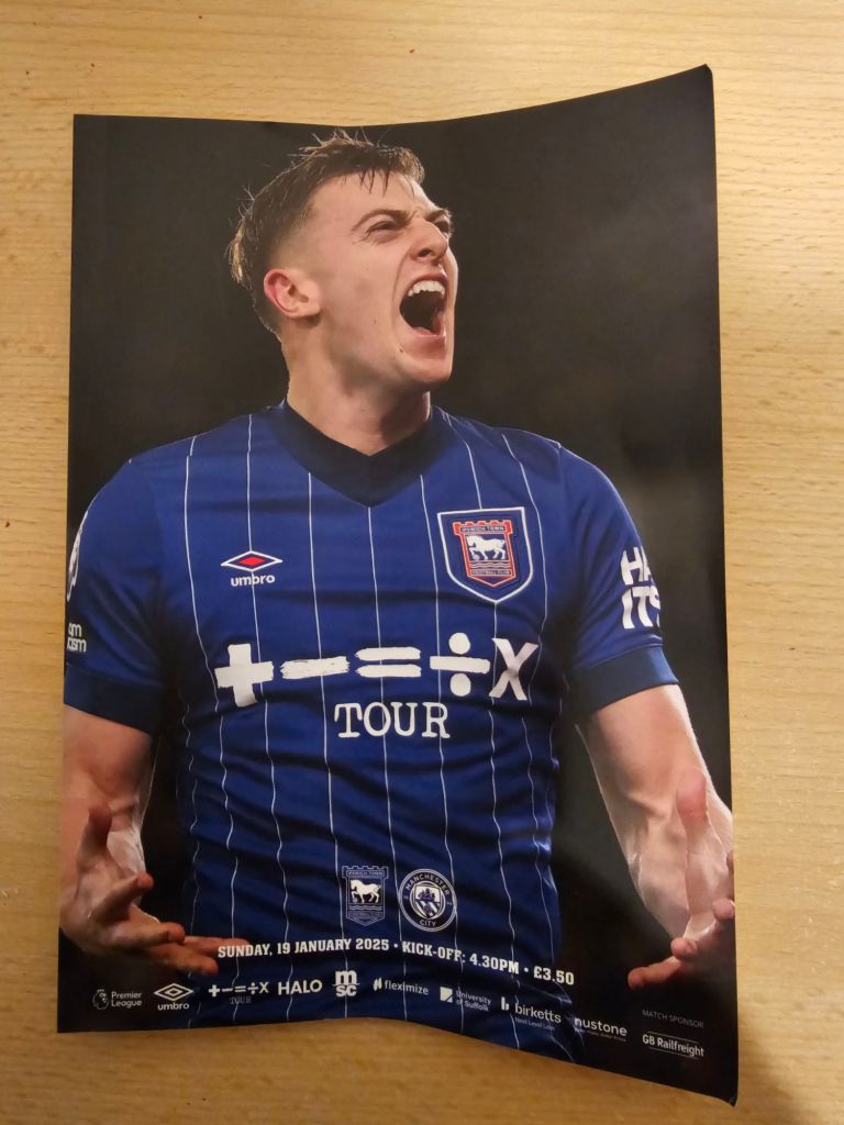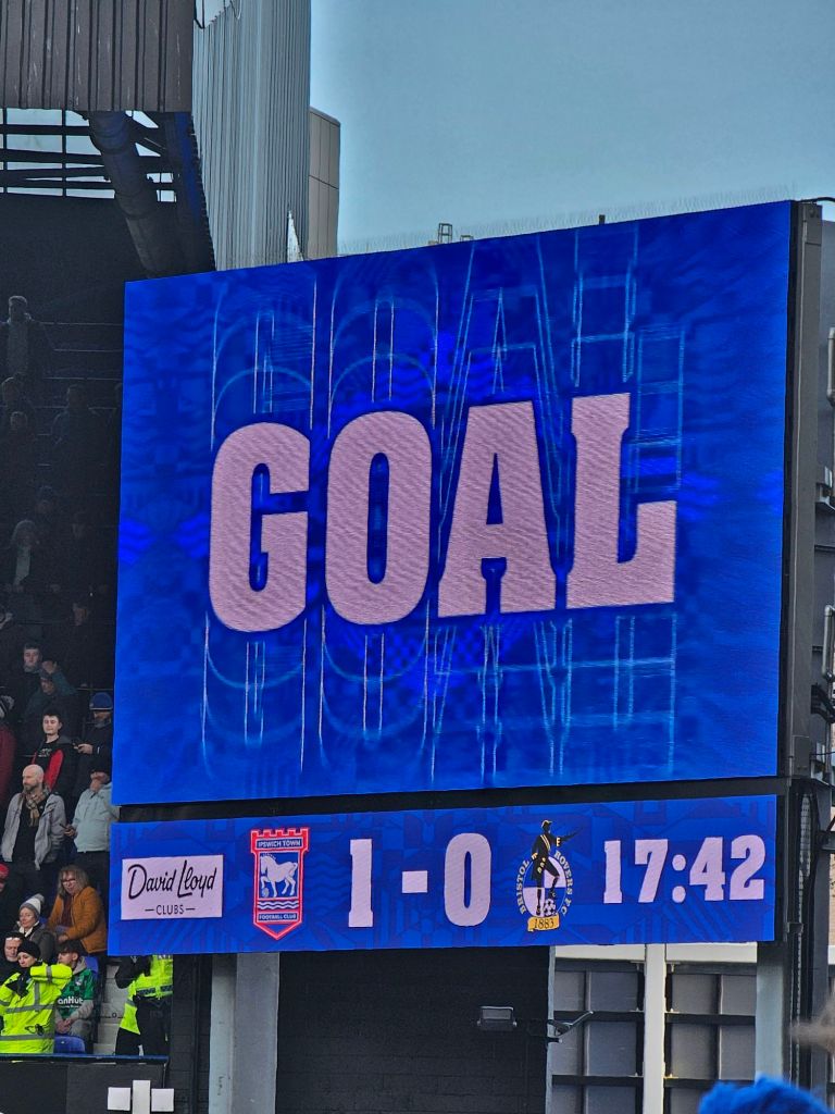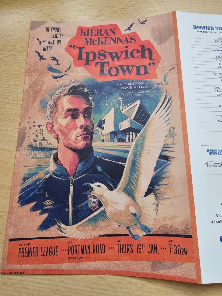 The clubhouse is welcoming and populated with happy pre-match drinkers. I buy a bottle of Adnams’ almost non-alcoholic ‘Ghostship’ (£3.20) and the bar maid asks if I’d like a glass, I would. I stand and look up at one of three TV screens showing Sky TV. From a hatch, behind which is the clubhouse kitchen, a middle-aged woman looks out glumly. “Fed up?” I ask her. “Bored” she says “It was busy, and now it’s quiet”. This lady seems responsible for fulfilling the whole crowd’s need for food and hot drink on her own but it will soon be kick-off, so for now she’s not needed.