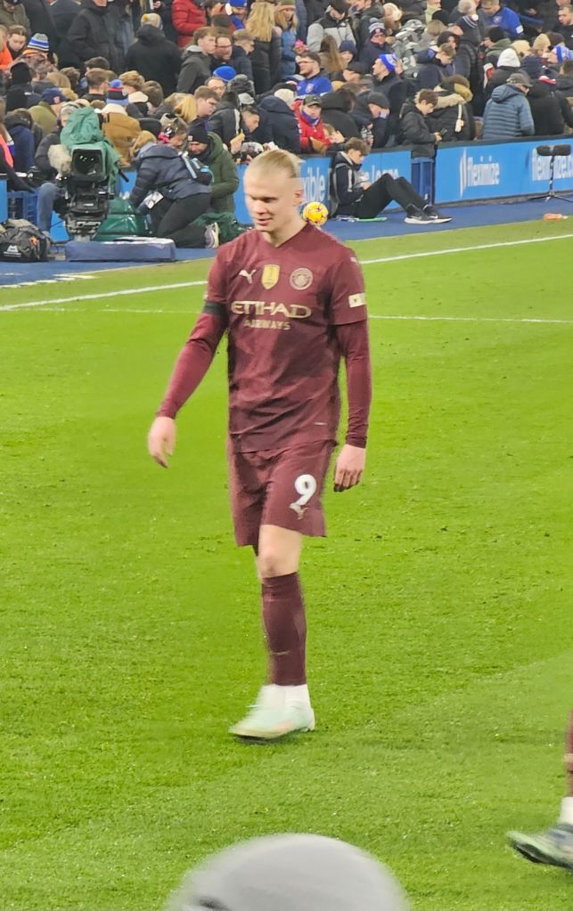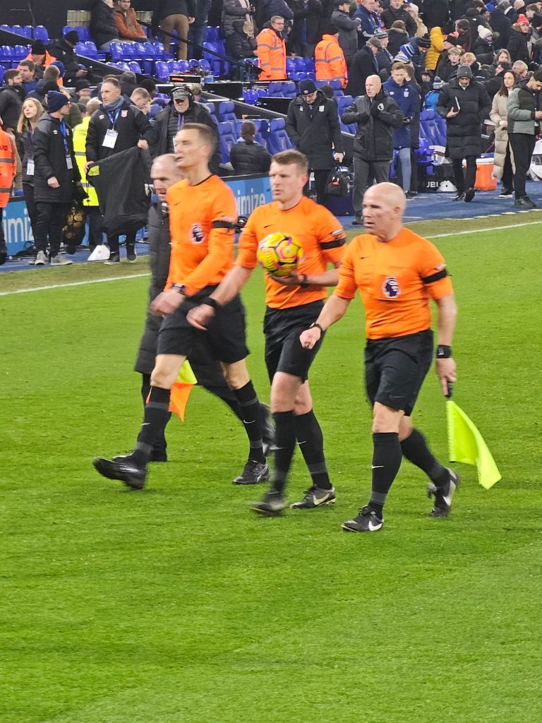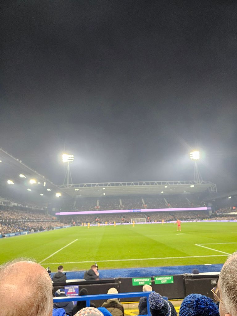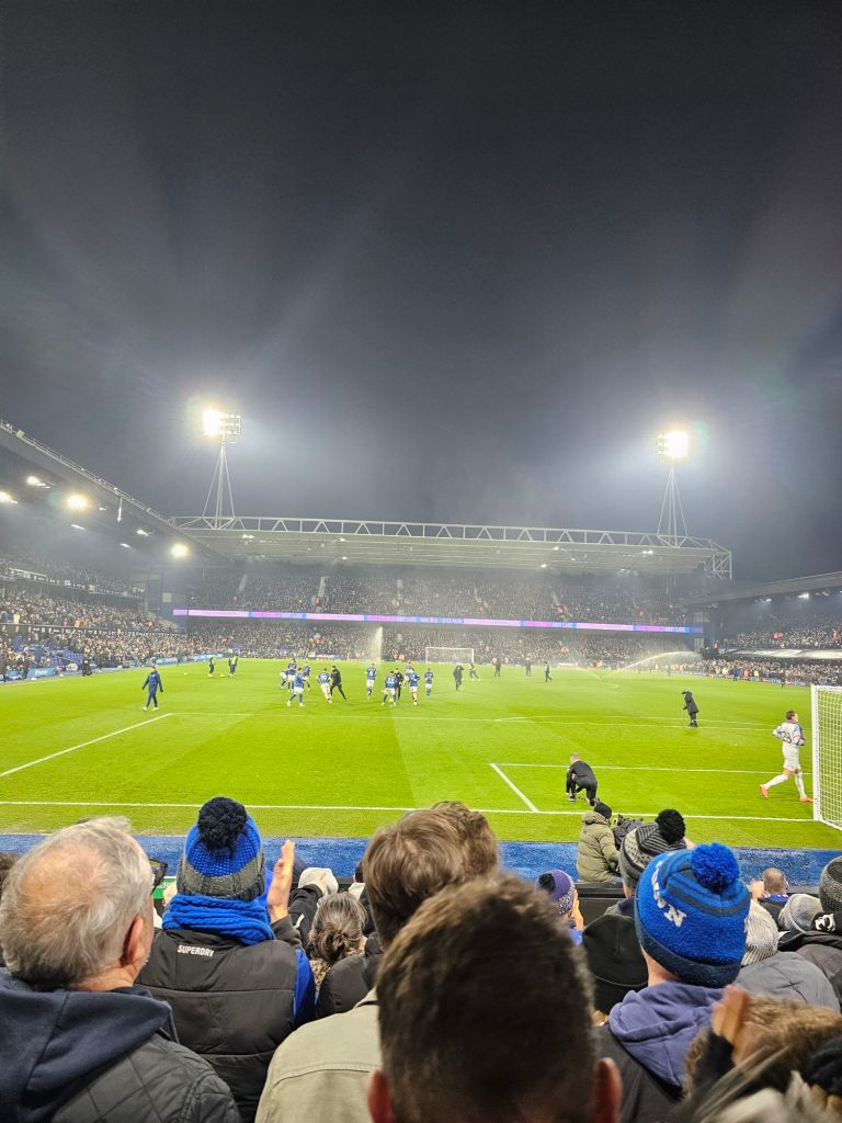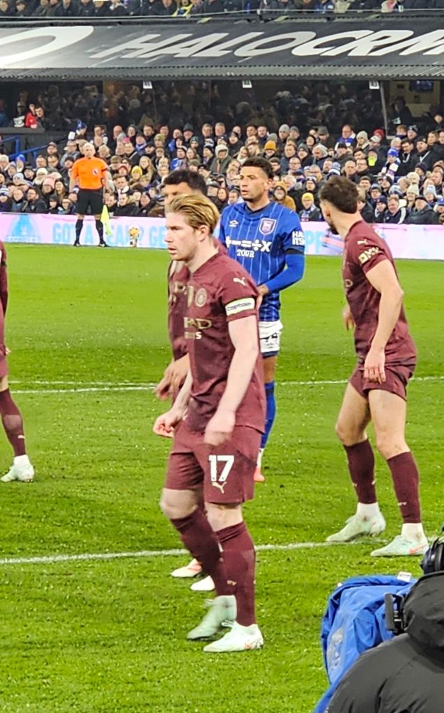The pap-rock gives way to Jeff Beck’s ‘Hi-Ho Silver Lining’ and the two teams amble onto the pitch; if there is any shaking of hands or other gestures of sportsmanship I miss them. I stand close to the home team dugout and next to me a man talking into his mobile phone says “We got two meal deals at the Co-op before we came out, so we ‘ad them”. In the ‘technical area’ in front of the dugout, a track-suited man calls out to the home players “Ave a look, ‘ave a look, just be aware of the fuckin’ double bluff”. I have no idea what he means, and decide not to ask him.