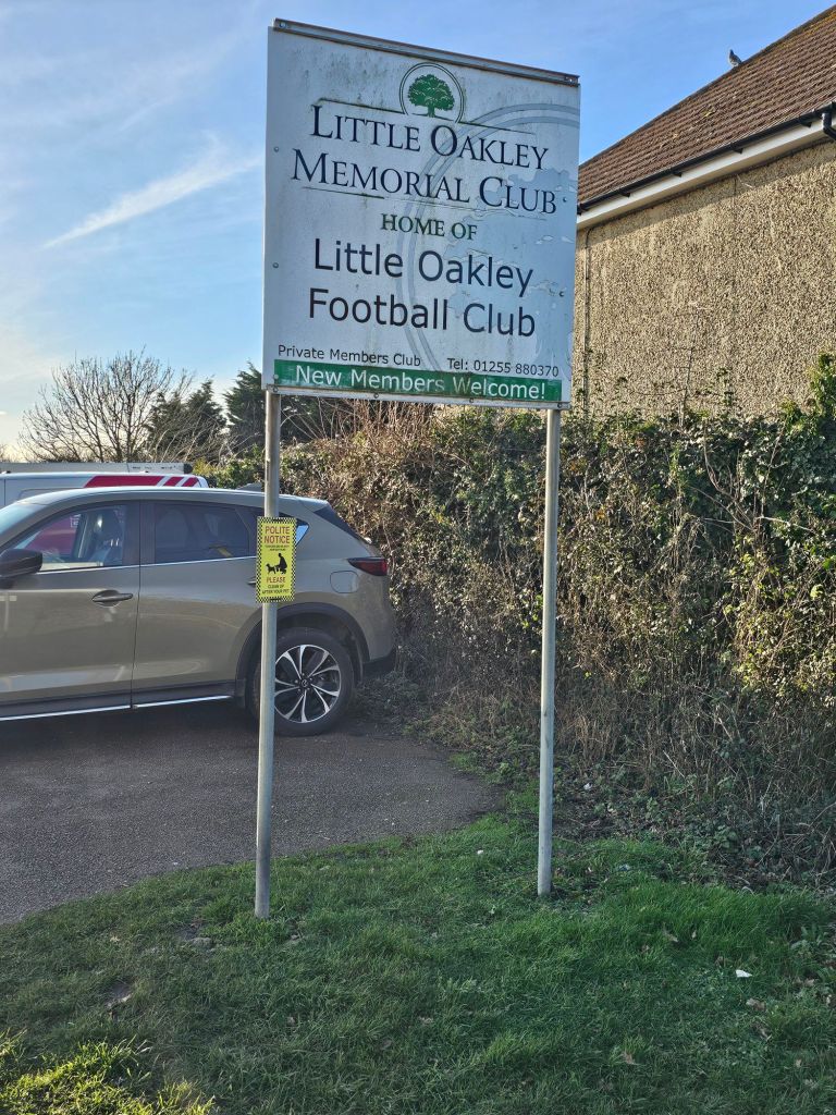 The village of Little Oakley in Essex, Wikipedia tells us, had a population in 2011 of 1,171 and is on the outskirts of Harwich. More precisely, Google maps tells us that Little Oakley is a four kilometre, fifty-eight minute walk from Harwich International railway station. Now, I reckon I could walk 4 kilometres in less than 58 minutes, but I am nevertheless of a lazy disposition and therefore, today I have opted to drive the thirty-six kilometres from my house to the Memorial Ground, home of Little Oakley FC in my planet saving Citroen e-C4, rather than enjoy a travel melange of rail, bus and walking, which would take me between one and half and two and a half hours depending on connections. Today at the Memorial Ground, Little Oakley FC are playing Barking in the Essex Senior League, the ninth level of English league football.
