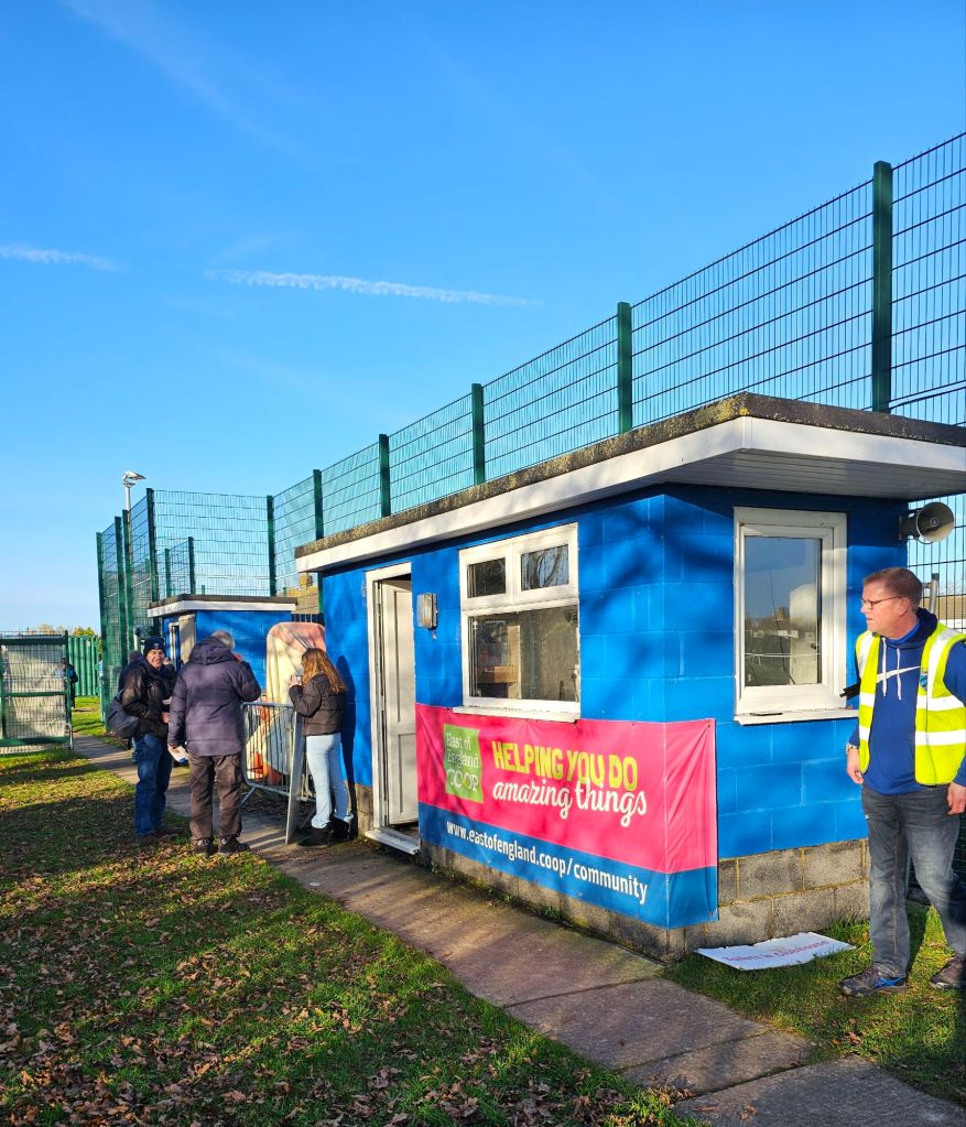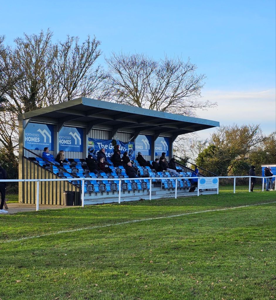 It’s a beautiful, bright, clear, winter’s day and but for a Luton van pulling out in front of me from a lay-by on the A120, I have a relaxed, trouble-free journey, played out to a soundtrack of the Saturday afternoon pre-match football coverage on BBC Radio Essex, featuring amongst others, the dulcet tones of Glenn Pennyfather and Danny Cowley. My Citroen’s SatNav doesn’t seem to know about the Memorial Ground, so my journey ends with an abrupt left hand turn when suddenly from the B1414 I see the street sign for Lodge Road, which I remember from looking at a map is adjacent to the Memorial Ground. I park up at the side of the narrow approach road, beneath an avenue of trees with a deep ditch on one side and wooden fence on the other on which several signs plead with drivers not to park too close to it. I make the short walk to the clubhouse enjoying the sound of birdsong whilst inhaling the smell of hot cooking oil, probably chip fat.