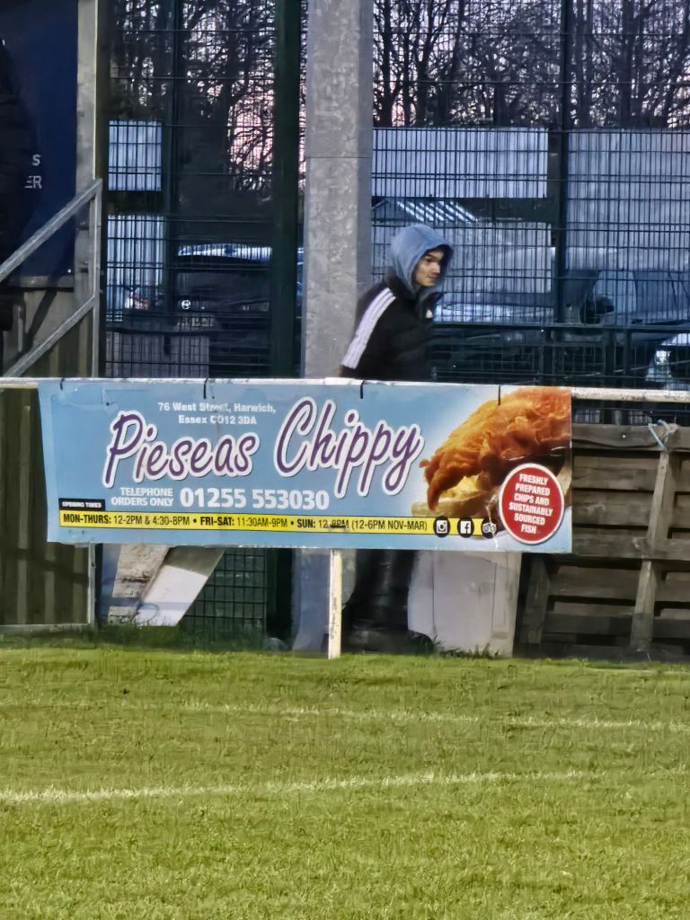 With the aftermath of the penalty, the worst of the afternoon’s fractiousness is over and much of the final twenty minutes plays out against the back-drop of a glorious, blood red sunset, A friendly man wearing a day-glo gilet bearing the words ‘LO Media Officer’ on the back, talks to me briefly and asks if I’m a ground hopper, “Not really” I tell him, “ I usually watch Ipswich”, although I don’t let on that for forty years I’ve kept a list of every game I’ve ever been to. He’s soon photographing the main stand against the sunset however, and the match plays out shifting freely from end to end, but with neither side looking much like scoring the winning goal. Meanwhile, I wonder at the name of a local fish and chip shop, Pieseas Chippy, which is advertised at the pitch side.