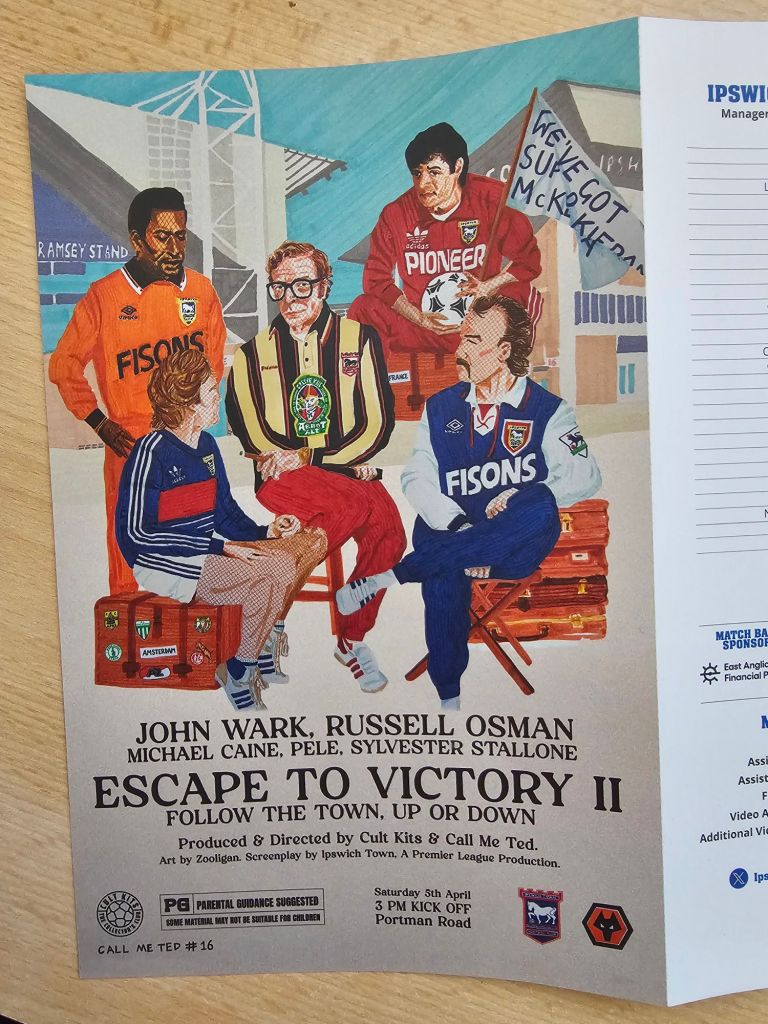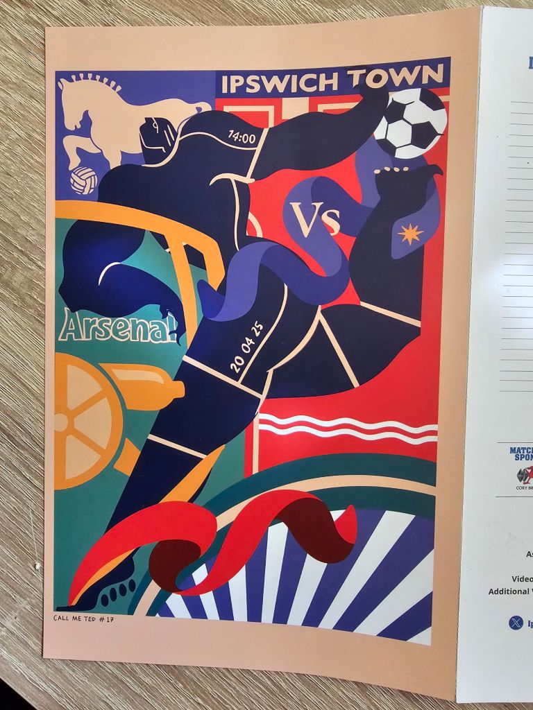 The bus journey is mercifully short, and I’m soon sat on a train next to Gary looking out for polar bears. I spot a couple as we pass through Wherstead, and when I tell Gary he asks if they were waving to the train. I tell him they were, and that it was a scene reminiscent of a polar bear-based version of the Railway Children, but without Jenny Agutter. In Ipswich, our carriage lands perfectly adjacent to the bridge over the tracks that has fewest steps, and with the benefit of the energy saved we are soon in Portman Road buying programmes (£3.50 each) and looking at what the design of the programme front cover should look like. Today’s design is a mash of the Town and Arsenal club crests and for some reason reminds me a little of the programme for the 1951 Festival of Britain ,I think it’s the colours. Cursing the grandees of Umbro for the actual programme cover picture (Conor Chaplin’s modelling for Edvard Munch’s ‘The Scream’), we ascend to the Arb, where for £8.94 including Camra discount I buy a pint of Mauldon’s Suffolk Pride for me and a pint of Lager 43 for Gary. Drinks in hand we find Mick in the beer garden and join him to talk of film, religion, sexual politics, double funerals, beer, wedding anniversaries, incels and birthdays before Gary buys a repeat round of drinks, including a Jameson whisky for Mick. Eventually Mick says “Its twenty to three, we’d better leave” so we do.