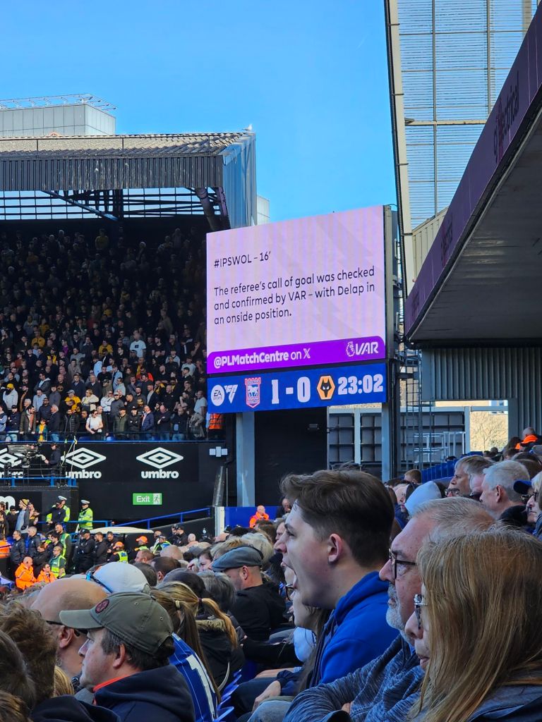 Four minutes later and Leif Davis’s studs come into contact with the back of Bukayo Saka’s ankle. Saka leaps into the air like a startled cat and Davis is sent off for endangering life, which VAR confirms. Later this evening in France, in an almost identical incident a St Etienne player (Lucas Stassin) will be sent off for a similar foul against the less feline Corentin Tolisso of OL, but this will then be rescinded and changed to a yellow card when the referee looks at the VAR screen. Tolisso will be carried off on a stretcher and Lucas Stassin will go on to score the winning goal. Sadly, Ipswich is not St Etienne.