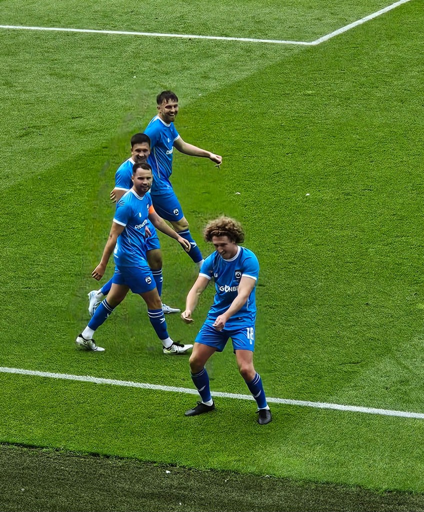 The opening minutes belong to Haverfordwest, who sensibly look keen to delete the one goal deficit from the first leg as soon as possible.  The understandably more sun-tanned Floriana players however, look like they are taking time to acclimatise to west Wales and soon concede a corner, and then another from which the ball is headed back at the far post and at the second attempt an unmarked Greg Walters boots it conclusively into the Floriana goal net.  The match is barely more than ten minutes-old and the aggregate scores are level. I remark to Paulene that I think Walters, as well as being the goal scorer, has the best hair on the pitch, it being reminiscent of former Ipswich and Arsenal player Alan Sunderland, but fluffier.
