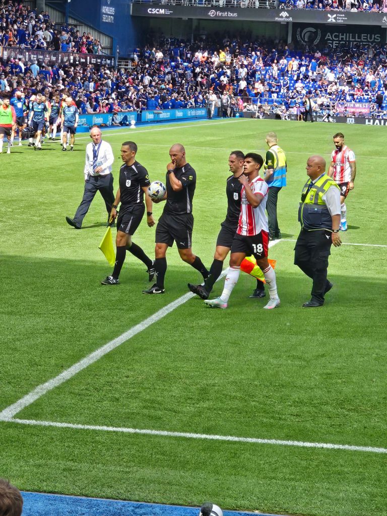 Nineteen minutes have gone the way of the previous twenty-nine and a half days of August and the Derby fans chant “Football in a library, do-do-do”, illustrating how human evolution seems to be standing still. A break by Kasey McAteer, and a cross leads to Leif Davis having Town’s first decent shot on goal but it bounces conveniently into the arms of the man from the highways department, and Town begin to get to grips with Derby’s WWF inspired style of play. Twenty-seven minutes are up and Town earn a corner. “Come on you Blues” chant a handful of us lamely. Five minutes later a Conor Chaplin shot earns another corner. More half-hearted chants but they’re all Town need and as the ball sails over the flailing fist of the bloke from the Council, Jacob Greaves applies a stooping header, the humblest of all headers, to put Town one-nil up.