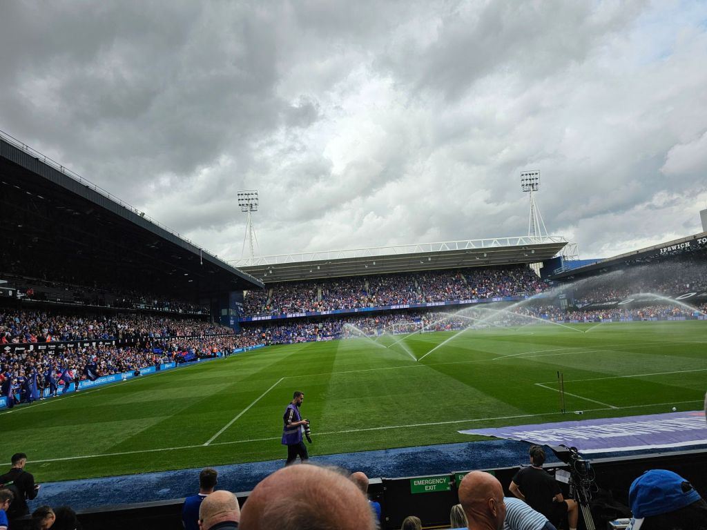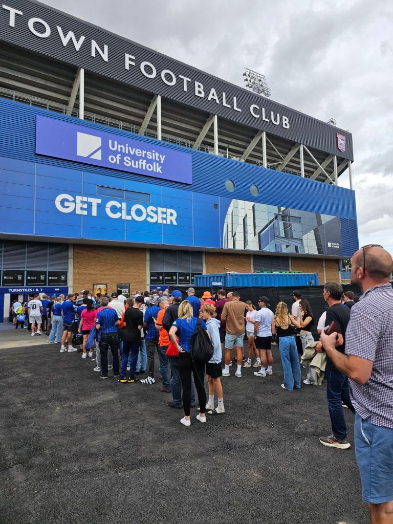 It feels like a long arduous walk down Princes Street and Portman Road and into Sir Alf Ramsey Way alongside a gently limping Gary, and our lack of speed worsens the confused pangs of longing I feel as I pass numerous programme sellers. Eventually, we make it to the Fanzone with its loud music, ice cream van, beer tent and huge tv screen, which today is telling us how lucky we are we aren’t from ‘Up North’ by showing Middlesbrough versus Sheffield United. Many people seem strangely mesmerised by it, however.
