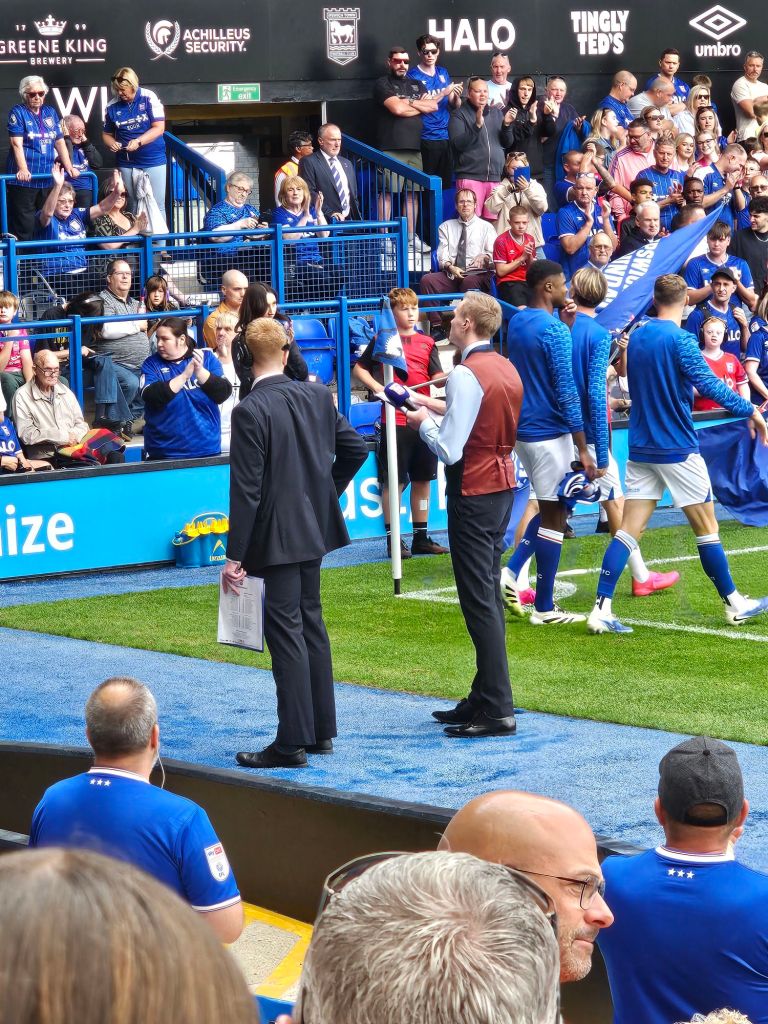 At about a quarter to three a man in a day-glo coat effectively tells us to leave and go to our seats. He seems a little curt, even rude, but I let it pass considering that a lot of people have strange jobs nowadays, and Gary and I soon bid our farewells. The blue skies punctuated with white cloud have given way to grey cloud and there is a queue to the Sir Alf Ramsey stand, but it moves as if well lubricated and I am soon passing through the hallowed turnstile 62, named in honour of Sir Alf Ramsey’s team’s achievements back in 1962. I arrive at my seat moments before Fiona arrives at hers and not long after Pat from Clacton reached hers. The man from Stowmarket (Paul), ever-present Phil who never misses a game, and his son Elwood are already here too and I’m in good time to join in, in the manner of a Frenchman at the Stade Marie Marvinght or Stade Marcel Picot when the excitable young stadium announcer, who today has seemingly mislaid his jacket but wears a shiny brown waistcoat, reads out the team.