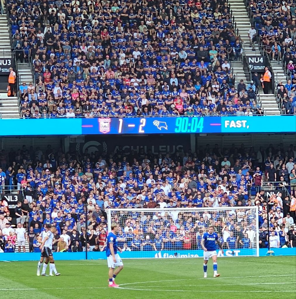 But then, as once more and then once more again Town sling the ball into the Derby penalty area, the referee awards a penalty. I couldn’t see why from the far end of the ground, but in the absence of VAR I trust the referee who obviously knows what he’s doing, on this occasion. Jack Clarke steps up to take the penalty as the blokes behind me agree that they would have Ashley Young take it and the bloke next to me holds his head in his hands and seems to weep as he says “Not, Jack Clarke, please not Jack Clarke.” But happily, yes, Jack Clarke, as he takes one of the best penalties by an Ipswich player that I think I’ve ever seen, striking the ball hard and into a corner and with a bit of a curl on it too for good measure. There’s still time to win I say to myself, but it turns out there isn’t.