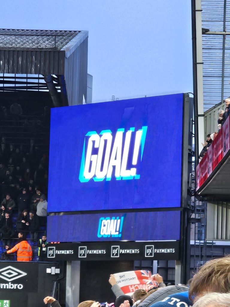 Almost two-thirds of our afternoon’s ‘football experience’ has been experienced. Leif Davis crosses low, Nunez shoots, Cumming saves and Town have another corner. Fiona and Pat from Clacton discuss Pat’s handbag. Pat says she won’t get the masturbating monkey lucky charm out today, it’s too cold; anyway, we’re still winning. A Town free-kick is awarded; Nunez curls the ball over the defensive wall towards the top corner of the goal, but Cumming claws the ball away spectacularly.