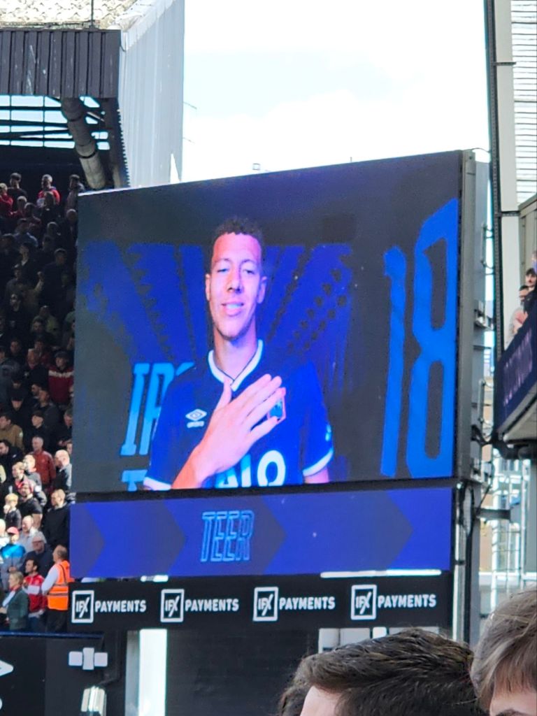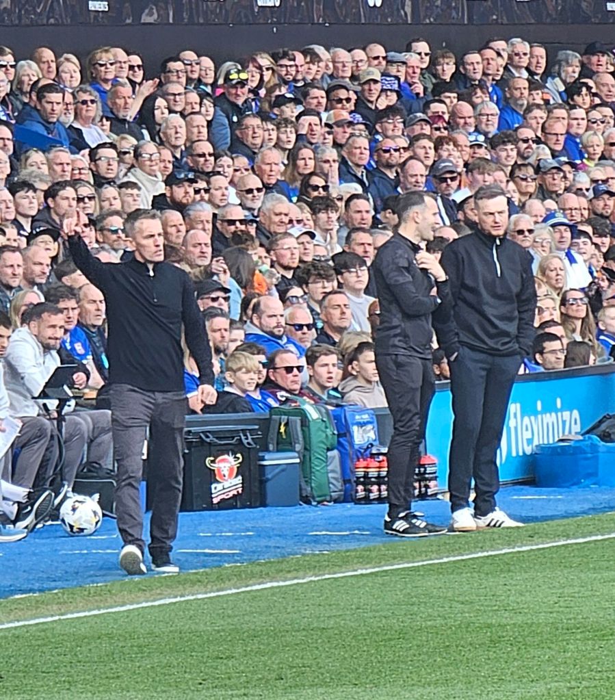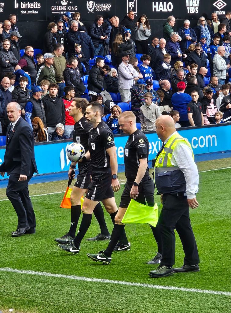 Half-time is only about seven minutes away and Jaden Philogene has a rare shot on goal which gives Town a fourth corner and a handful of us another opportunity to encourage the team vocally. Town have been the better team this first half, but the Smoggies are blaming Mr Gillett. “You’re not fit to referee” they sing, like chapel-going Welshman and then more experimentally, and as Brynn takes the inevitable goal-kick following Town’s corner, “Shit referee, Ole, Ole, Ole”. The goal-kick skews out into touch and I tell Fiona “I don’t know about the referee, but the goalkeeper’s not that good either”.