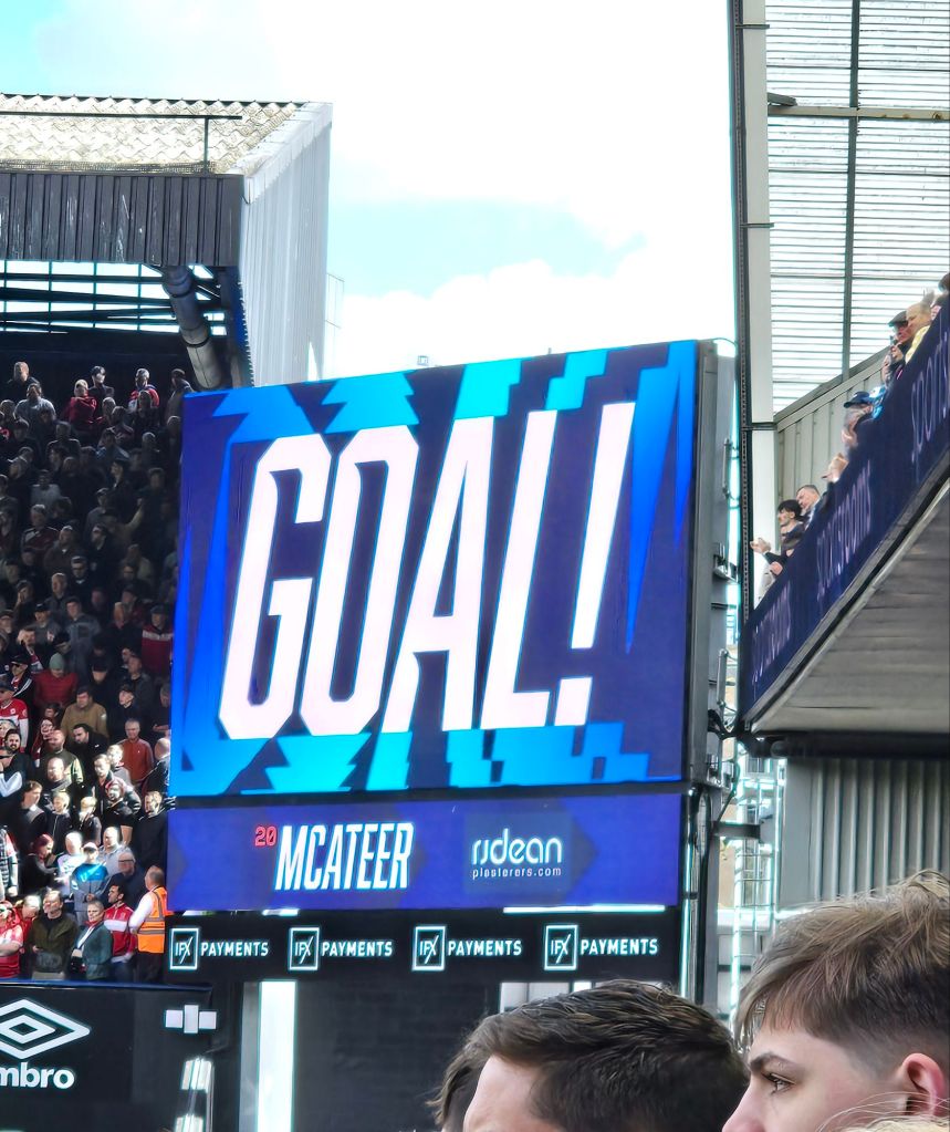 Eighteen minutes of normal time remain when Eggy replaces McAteer, fourteen when Mehmeti shoots straight at Brynn, and Town begin to claw their way back into the contest with a corner seven minutes later and then two more substitutions with George Hirst and Dan Neil saying ‘hello’ and Ivan Azon and Azor Matusiwa saying ‘goodbye’. Six minutes of normal time remain when the excitable young stadium announcer thanks us for our ‘incredible’ support, which numerically speaking today amounts to 29,684. Incredible. Two more minutes have elapsed when a low cross from the right looks to be too far ahead of George Hirst for him to threaten the Boro goal but Adilson Malanda doesn’t make the same judgement and with the sort of slightly violent, gung-ho spirit he might have been infected with whilst playing in the USA, he pulls Hirst back and gifts Jack Clarke a shot at goal from the penalty spot. Clarke scores the penalty and despite another eight minutes of added on time being added on, and two more players for each team being booked, the game is drawn.