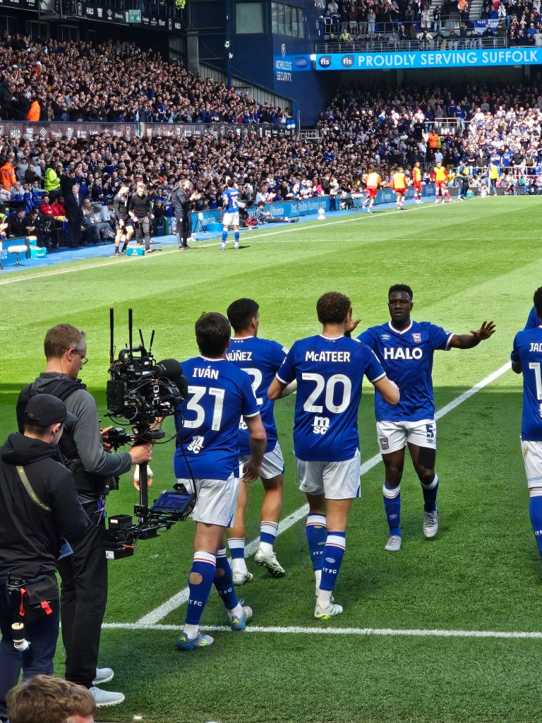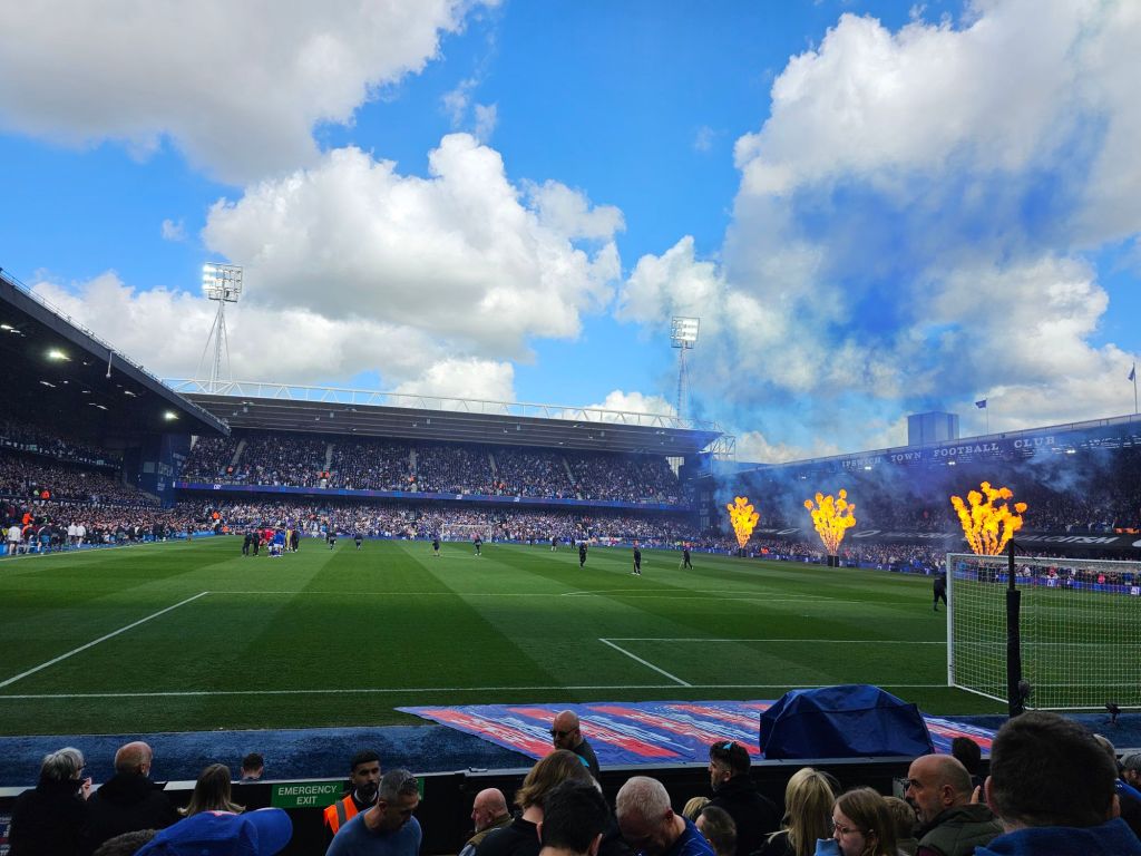 At the back of the Sir Alf Ramsey stand the queues to be checked for weapons, explosives and scrap metal are blissfully short and although the sacred turnstile 62 is temporarily afflicted by a man trying to gain entry using petrol coupons and a Tesco club card, I am soon stood next to Pat from Clacton waiting for her to finish photographing the flames leaping into the midday air in front of the Cobbold Stand so that I can sit down next to Fiona, next but one to the man from Stowmarket (Paul) and two rows behind ever-present Phil who never misses a game, and his son Elwood. I think to myself that it’s nice that everyone is present after a few absences for the previous match. Today, I have mysteriously arrived in time to hear the excitable young stadium announcer (EYSA) announce the whole team and I do my best to be like a Frenchman at Le Stadium in Toulouse or the Stade Raymond Kopa in Angers by bawling out the players surnames as EYSA reads them out , but with variable success because he is a beat or two ahead of the scoreboard