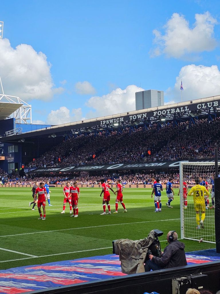 Back on the pitch, the first seven minutes have evaporated like the paraffin fumes, and Town are already starting to dominate to the extent that the smog monsters up in the Cobbold Stand (for that is what people from Teesside are called), are plaintively chanting “Come on Boro, Come on Boro”. The atmosphere is tense. “Shall we sing, shall we sing, shall we sing a song for you?” enquire the Smoggies (short for Smog-monsters) through the medium of song, but happily the half-expected medley of works by Chris Rea doesn’t materialise. Looking up into the gap between the roofs of the stands billowing white clouds tower above us in an otherwise clear blue sky. The seventeenth minute heralds Town’s first corner, as the result of a shot from Ivan Azon, but it is all too easily dealt with by the Boro players despite mine, Fionas and ever-present Phil’s chants of “Come on you Blues”. Four minutes on and again our chants seem as ineffectual as Nunez’s next corner kick.