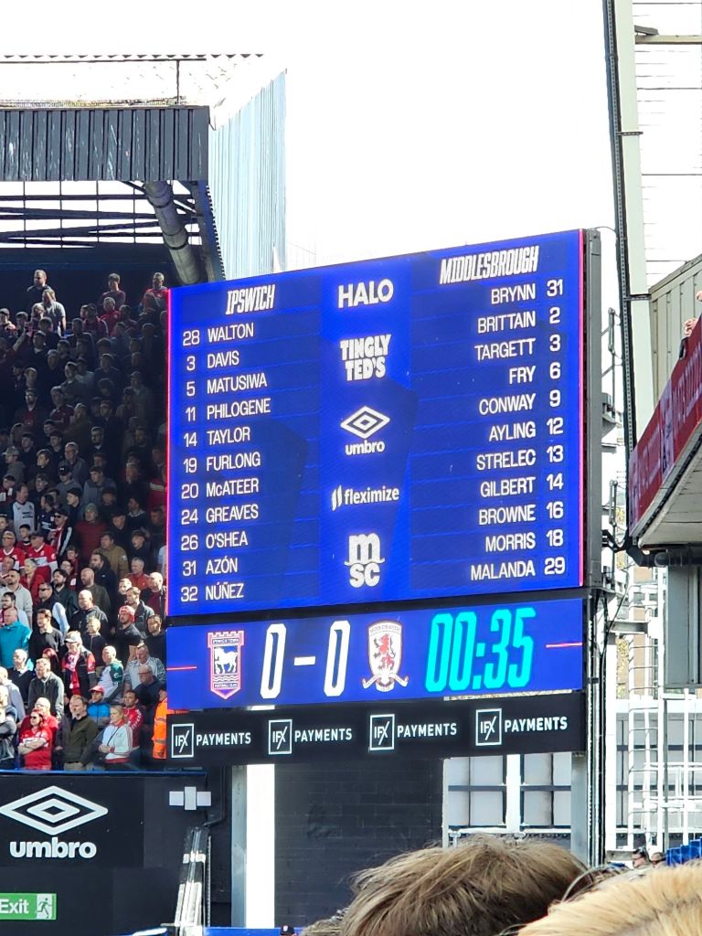 Brief respite and enjoyment arrive on fifty-three minutes as the afternoon’s first booking goes to Boro’s Matt Targett who has fouled Jack Taylor. I speculate that a matt target is easier to hit than a glossy one which might produce awkward reflections and that he perhaps has a sister who is formally known as Miss Targett. As the game descends into its final half an hour the first substitutions see former Town loanee Jeremy Sarmiento applauded by the home supporters who may never forget his last-minute goal versus Southampton in 2024, before Ivan Azon hurriedly shoots over the Boro cross bar.