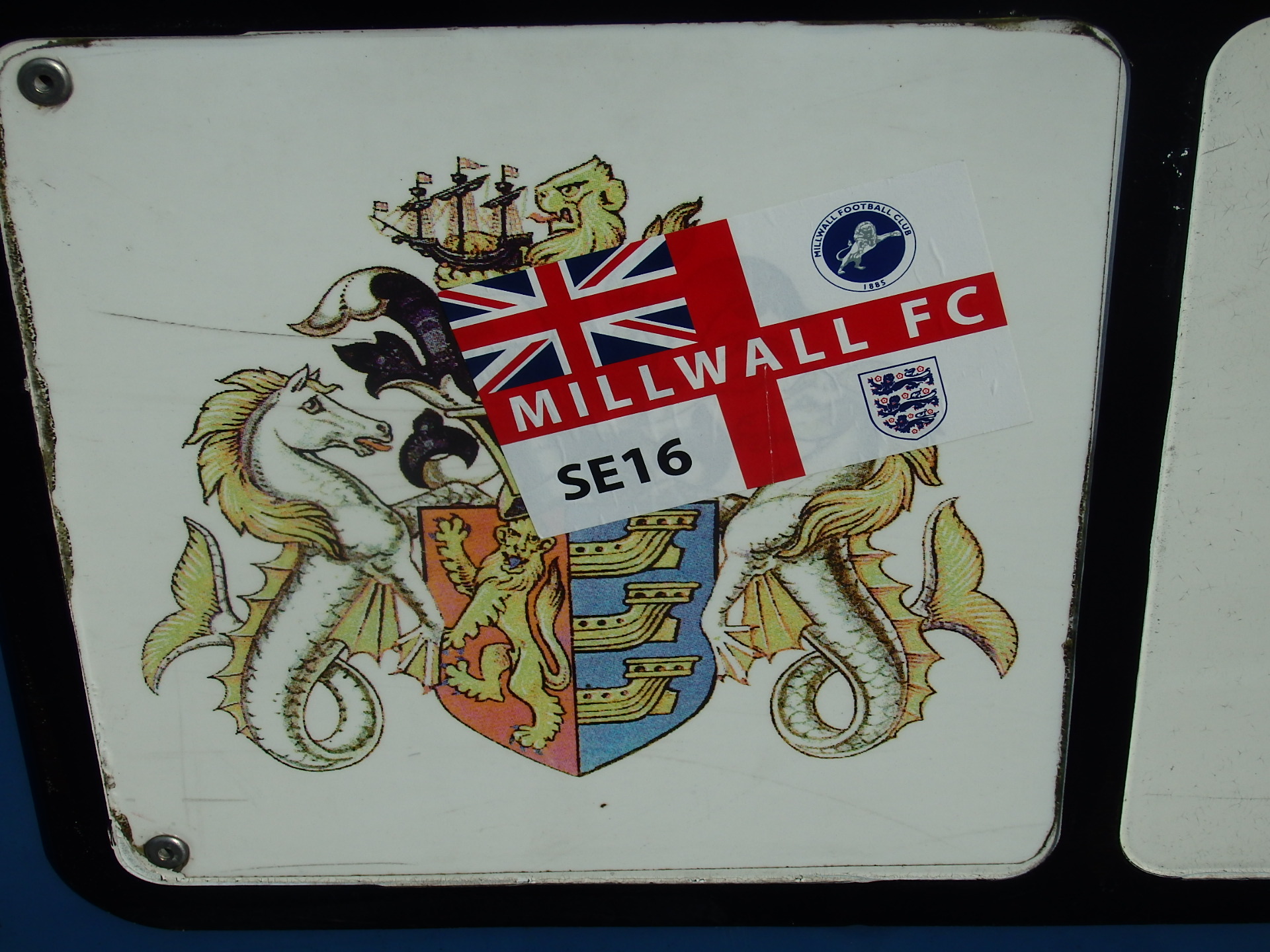OLYMPUS DIGITAL CAMERA April 11, 2018April 12, 2018 / martinpbrooks sticker possibly left by a Millwall fan on the borough crest on the Portman Road street sign