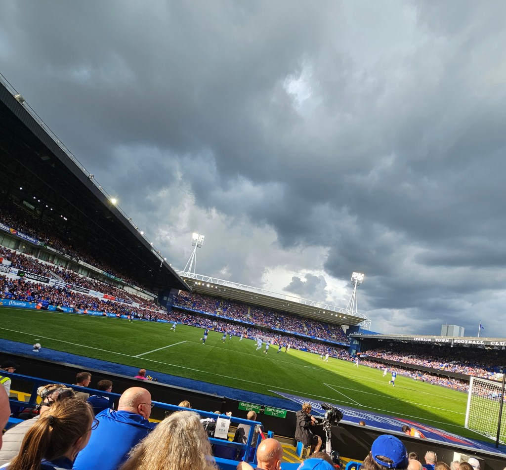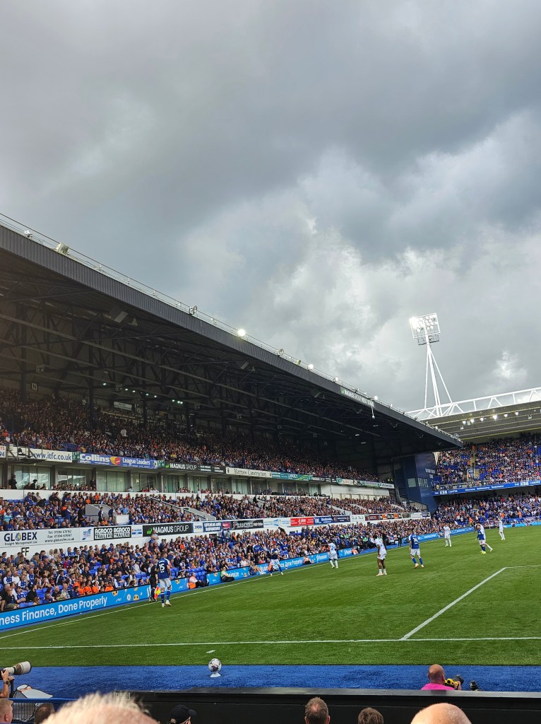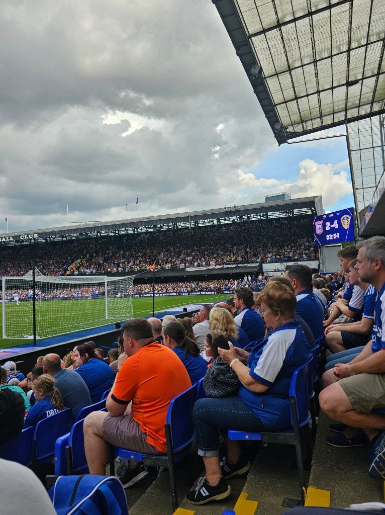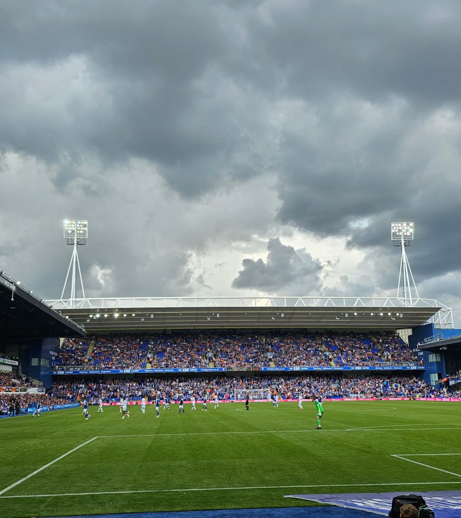 The row of seats in front of us consists mainly of men with grey hair whilst off to our left a younger bearded man looks a bit like Bob Ferris from the 1970’s sitcom The Likely Lads (actor Rodney Bewes). Behind us there is a gathering of men and women in day-glo tabards; if they’re not orchestrating a “gillets jaune” style protest I guess they must be the first aiders and stewards watching the match. At the front of the stand clouds of smoke billow up from teenage vapers and then dissipate into the night air. I notice that Bob Ferris has quite girlish looking hands.