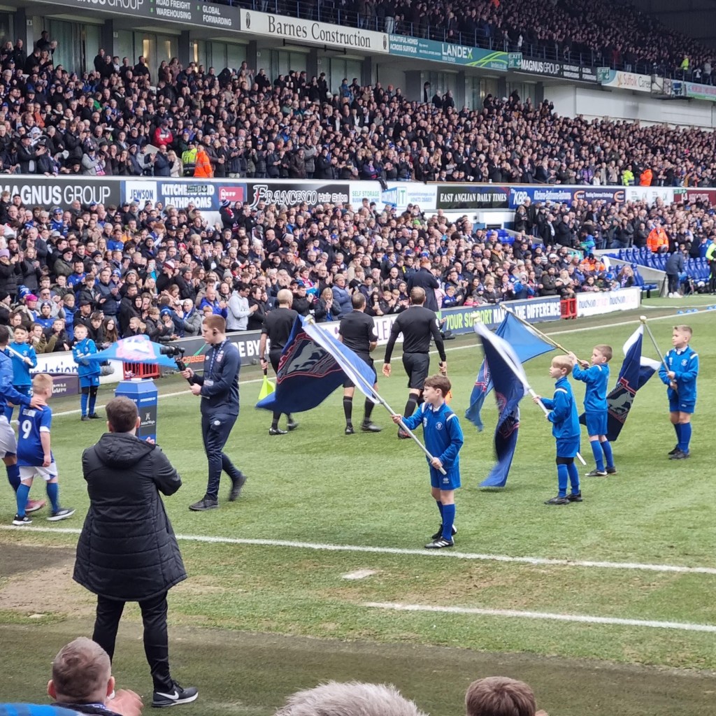 The queue at turnstile 62 moves quickly, although not as quickly as that at turnstile 61, but before I know it I’ve drained my bladder , waved to a woman I know but whose name I can’t remember and am hearing Pat from Clacton say “Here he is” as I shuffle to my seat next to Fiona, next but one to the man from Stowmarket (Paul), and two rows behind ever-present Phil who never misses a game. With the game on Sky TV tonight we are treated to erupting flames and momentarily warmed faces as the teams and their acolytes stream onto the pitch. I half expect to detect the smell of singed hair and melted polyester but fortunately never do. Murphy the stadium announcer reads out the teams and as ever almost gets half way through the team before he gets out of sync with the names appearing on the scoreboard. I shout the surnames out as they appear on the screen nevertheless, pretending to be French. If there was a lycee or Conservatoire for stadium announcers Murphy would be in the remedial class.