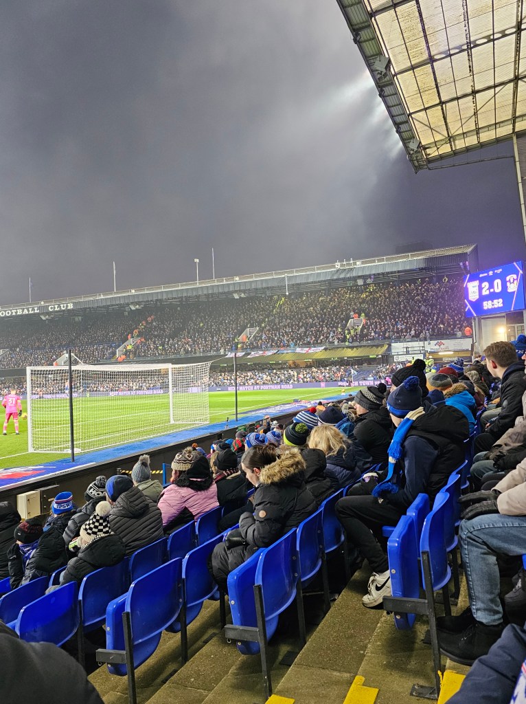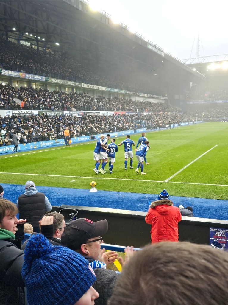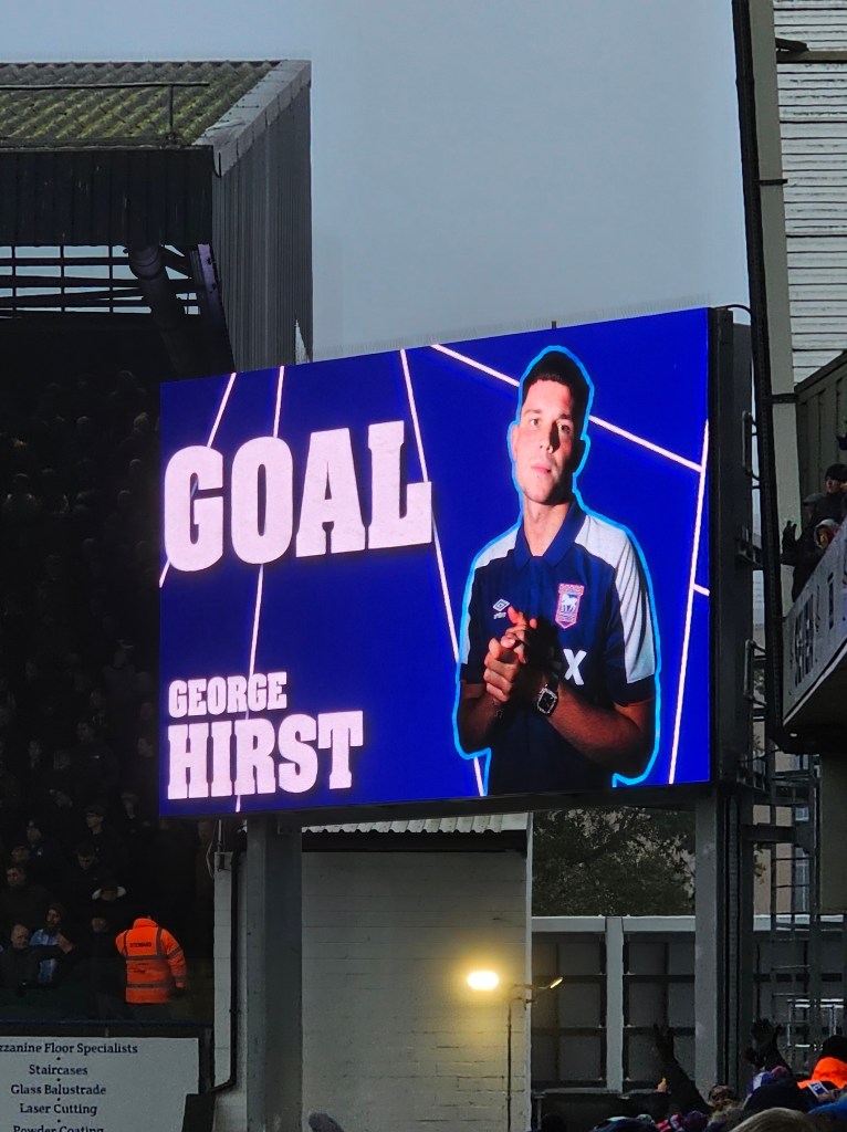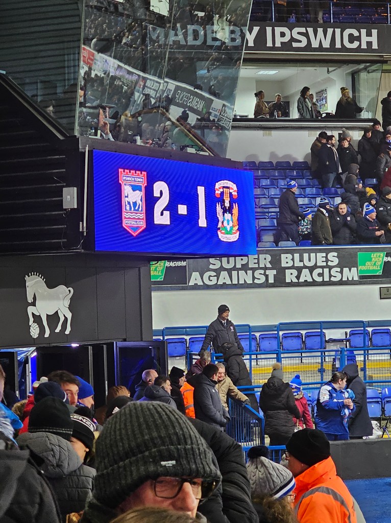 The last five minutes of the half have Ipswich dominating as Eggy is fouled, and then so is Nunez, and Coventry’s Grimes (aka Grimey) is booked before Town win two corners in quick succession and we chant ”Come On You Blues” for all we’re worth as the ball is sent back and forth across the Coventry goal mouth until Philogene squares it to Eggy, who curls it first time into the corner of the Coventry net from the edge of the penalty area. A minute of added-on time is added on, and the first half ends with Ipswich 1-0 up.