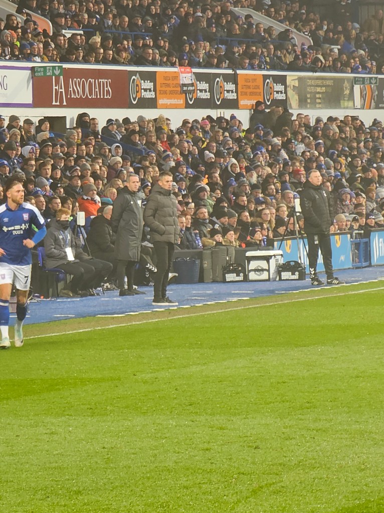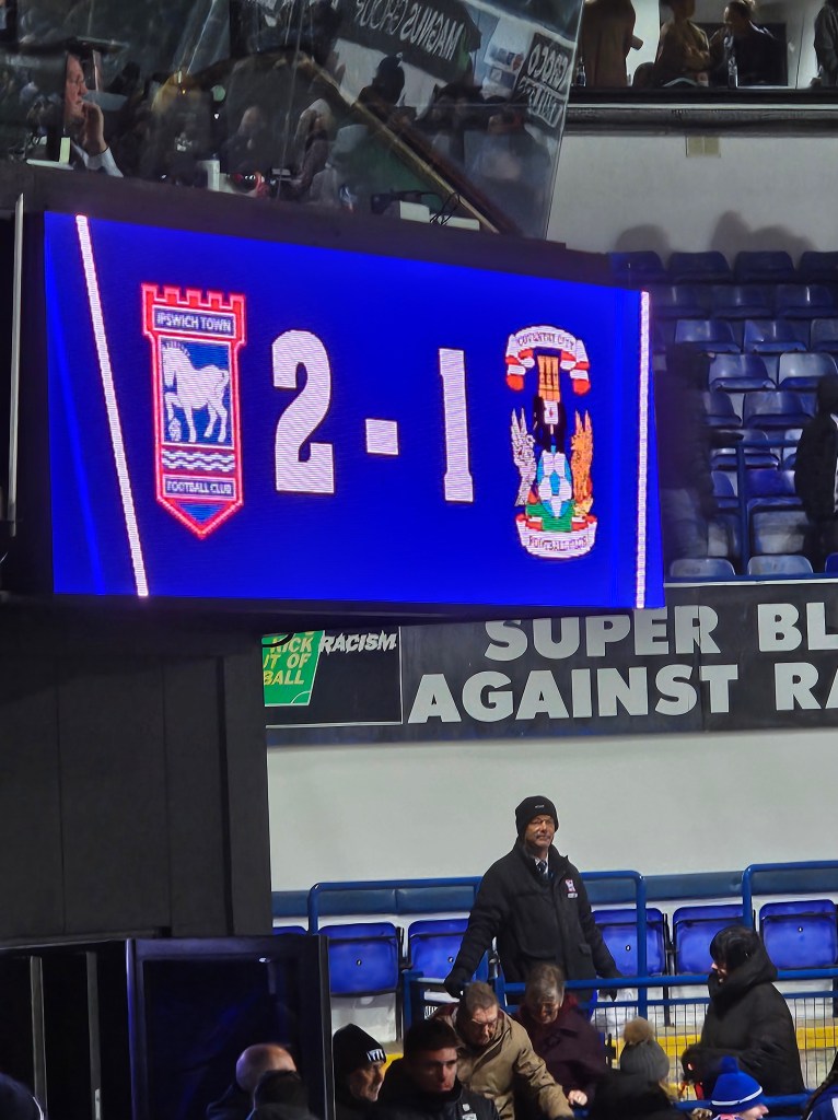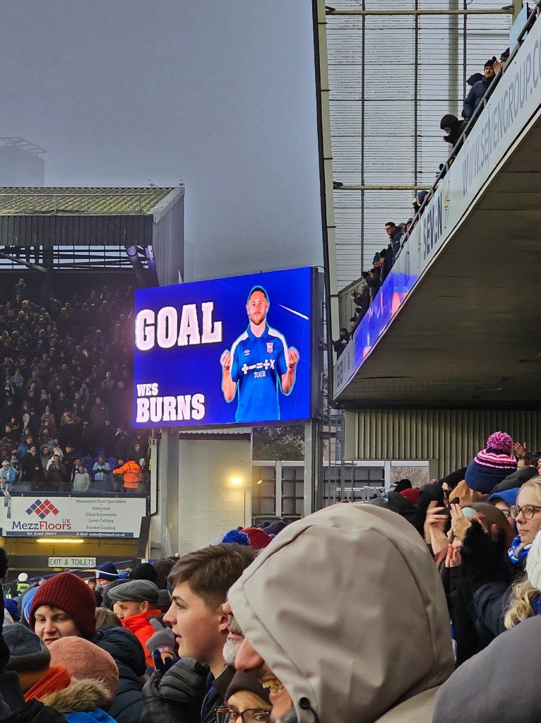 There are nine minutes left of normal time and a slow chant of “Oh when the Town go marching in” emanates from the Sir Bobby Robson stand, who really need to work on sounding more cheerful when we’re two-nil up with less than ten minutes to go. With the final minute of normal time Christian Walton merely catches the ball, and I think it’s one of the best saves I’ve ever seen and we’re into five minutes of time added on, even though there have only been seven of a possible ten substitutions and no injuries. I can only imagine we are recouping time spent on Coventry throw-ins but if this is the case the visitors are then hoist by their own petard as substitute Ivan Azon has a cross blocked but then strikes the ball obliquely into the Coventry net for a third Town goal, which confirms an ultimately comfortable victory.