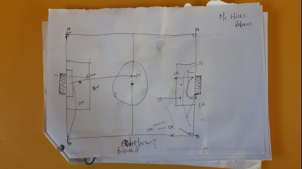 Things get no better for Rovers as after an innocuous looking foul Mr Gasson-Cox nevertheless seems annoyed with Prince Mutswunguma and standing his ground, summons him over before showing him the yellow card. “Wemberley, Wemberley” sing the Halesworth fans who should know better but are now too happy to care, but as they do so Rovers, perhaps realising their desperate position with only ten minutes left embark on a final push. It’s twenty to five as George Macrae makes another fine save, this time diving low to his left. “Two-nil down on your big day out” sing the pre-pubescents, not helping the situation with their cruel taunts and Rovers win another corner. The corner is cleared but moments later the ball is crossed low from the right and Rovers’ number eleven and captain Jarid Robson half volleys it high into the centre of the goal from a narrow angle and the score is a nerve-wracking 2-1.