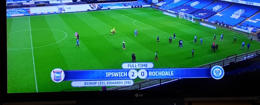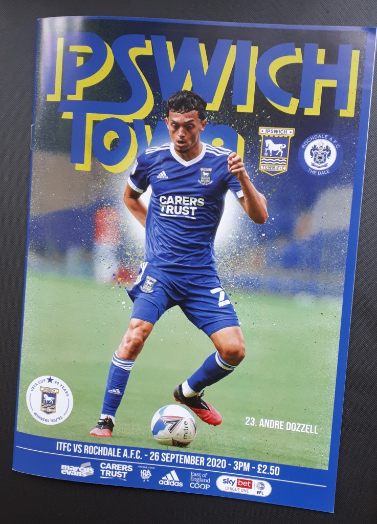 In the blink of an eye, or perhaps a little longer, the teams are on the pitch, knees are taken and applauded and Col. U, in rather boring red shirts and black shorts have kicked off defending the goal in front of what was Churchman’s cigarette factory the last time Col U won at Portman Road, which was on 13th October 1951; although in truth they have rarely had the opportunity since then. The noise inside the stadium is possibly the most I think I have ever heard made by 11,654 people at Portman Road. The Col U fans are giving it their all and the Town fans in the Sir Bobby Robson stand (lower tier) are answering back. For now at least, I am at last glad I printed that ticket, albeit four times.