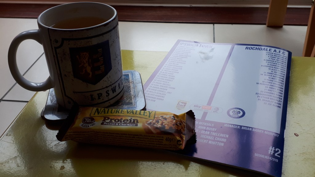 misses a game and son Elwood are already here and I settle down a couple of seats along before giving Elwood his birthday card and a few ITFC ‘goodies’. Phil tells me that earlier in the club shop Elwood had handed in an ITFC badge that he found on the floor to the staff serving behind the counter. One of the things I have given Elwood is such a badge; it seems like Elwood has been rewarded for his honesty and whilst we all know that’s not true, in an ideal world it would be.
