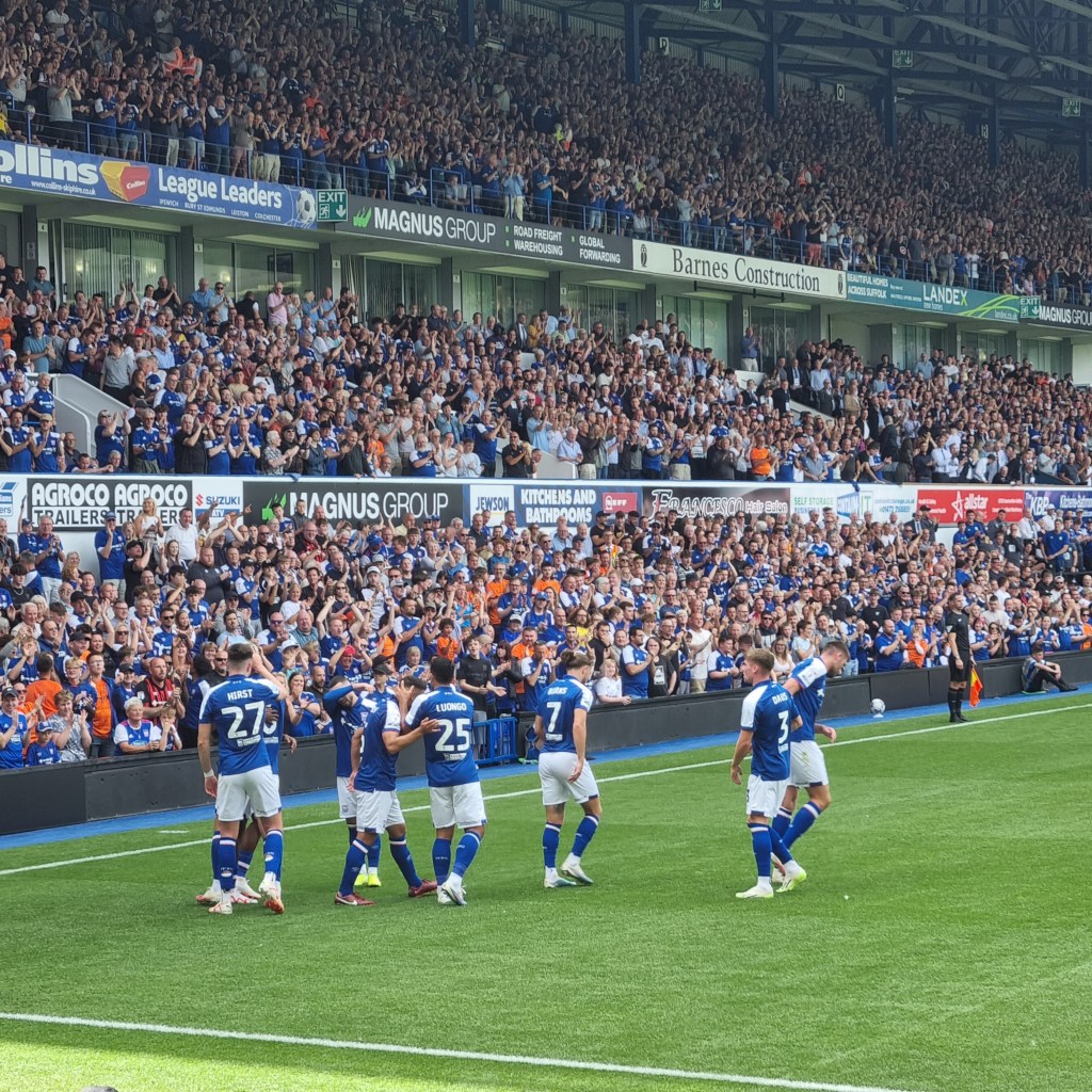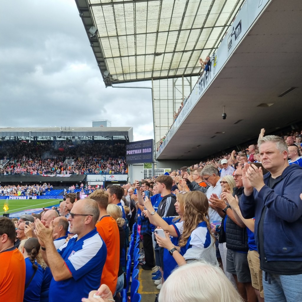 Happily, Town look more likely to score a fourth than concede a third, although Fiona admits to now feeling nervous because we have something to lose. Jack Taylor launches a precise cross field pass. “He’s a fucking good player” says the bloke behind me to his neighbour, but I think he’s talking about Omari Hutchinson because he then says something about him taking players on “…like Wes Burns used to”. Town win a couple of corners and Pat confirms that she’s having chicken drumsticks for tea again, because the ones she had last Saturday were lovely.