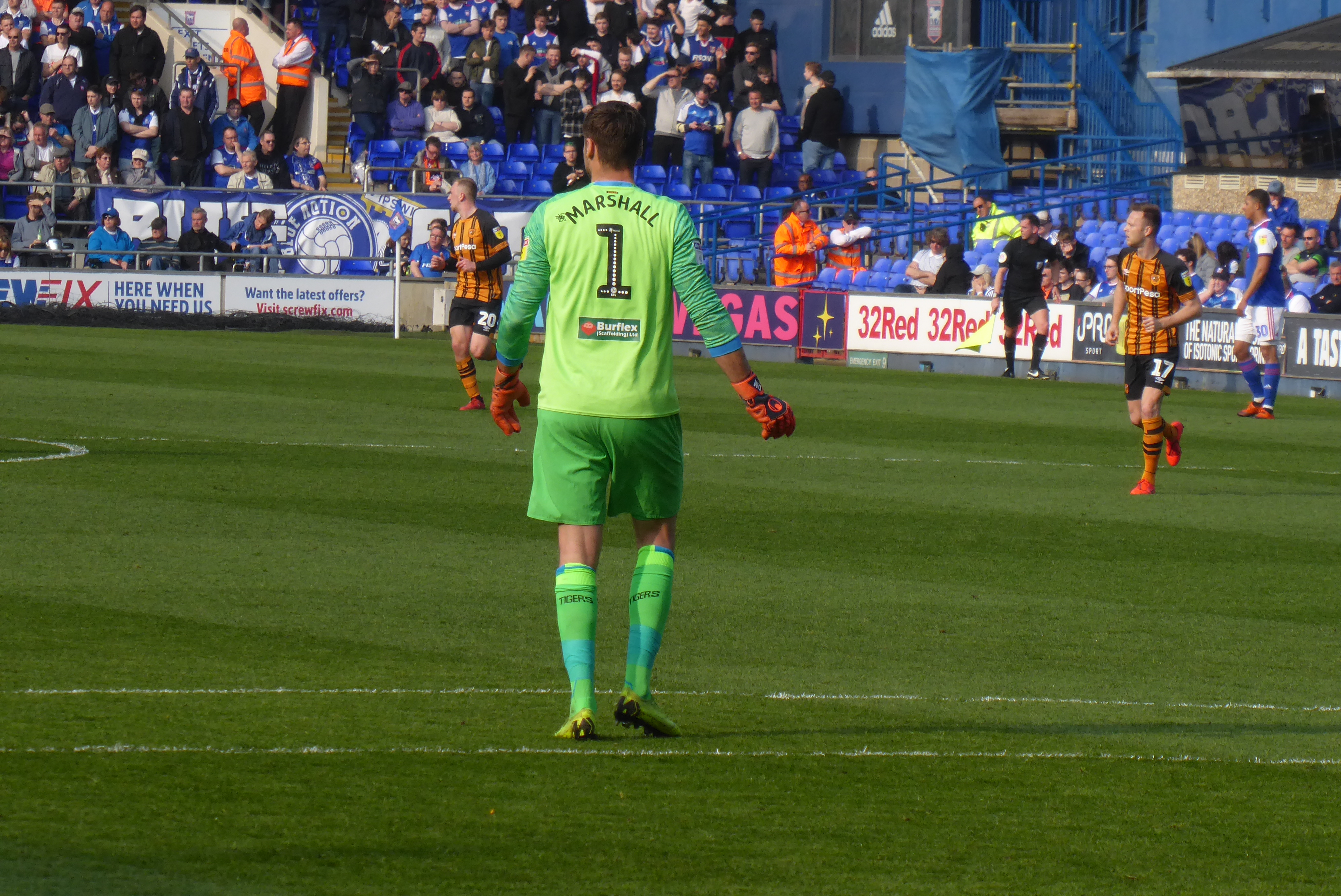 With Town in their customary blue and white and the turf glowing green beneath the floodlights this could be a scene conjured up from a Club Edition Subbuteo set. Town start well, passing the ball accurately, playing towards me and ever-present Phil and looking keen to do well. My attention is taken however by Accrington’s enormously tall number 5 whose name, the shoulder of his shirt tells me is Sykes, not Eric or even Bill sadly but Ross, like the fish fingers. “Cor! He’s skinny” shouts a voice behind me. Sykes’s gangliness is however overshadowed by that of Accy’s number 36 Jerome Opuku, a player on loan from Fulham whose flailing arms and legs give him the appearance of a piece of nineteenth century agricultural reaping machinery or a drunken octopus; when tackled he collapses to the floor like a puppet that has had its strings cut. That said he’s a half decent player.